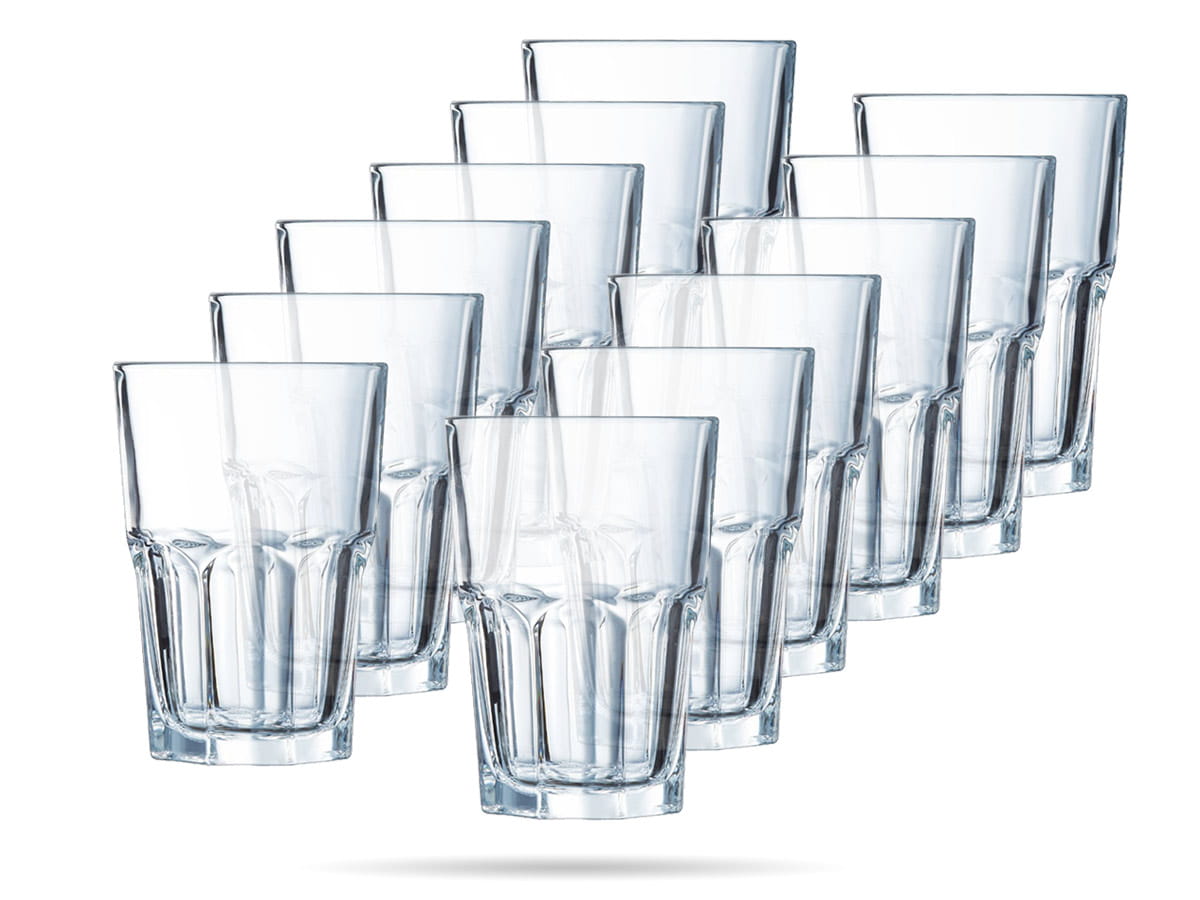 Zestaw szklanek Granity Arcoroc. Grube, mocne szklanki, świetnie sprawdzą się w domu i gastronomii. Szklanki do wody, soków, koktajli, drinków, kawy czy herbaty. Wysoka przejrzystość szkła, gładko wykończone brzegi i załamania na powierzchni szklanki Granity sprawiają, że jest wygodna w użyciu i atrakcyjnie prezentuje swoją zawartość.