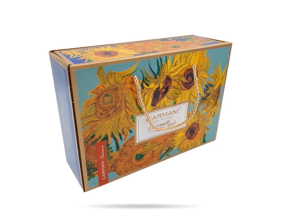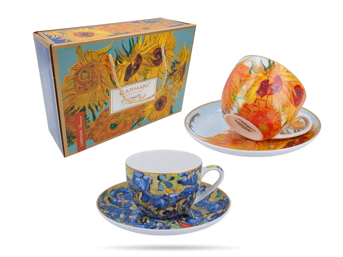 Porcelanowe filiżanki o pojemności 250 ml marki Carmani. Filiżanki zdobione motywami twórczości Vincenta Van Gogha, obrazami “Irysy” i “Słoneczniki”. Filiżanki z wygodnym uchwytem, idealne na porcję ulubionej kawy czy herbaty. Zapakowane w ozdobne pudełko mogą trafić wprost do rąk obdarowanej osoby. Carmani to praktyczny i niezwykle efektowny prezent na każdą okazję.