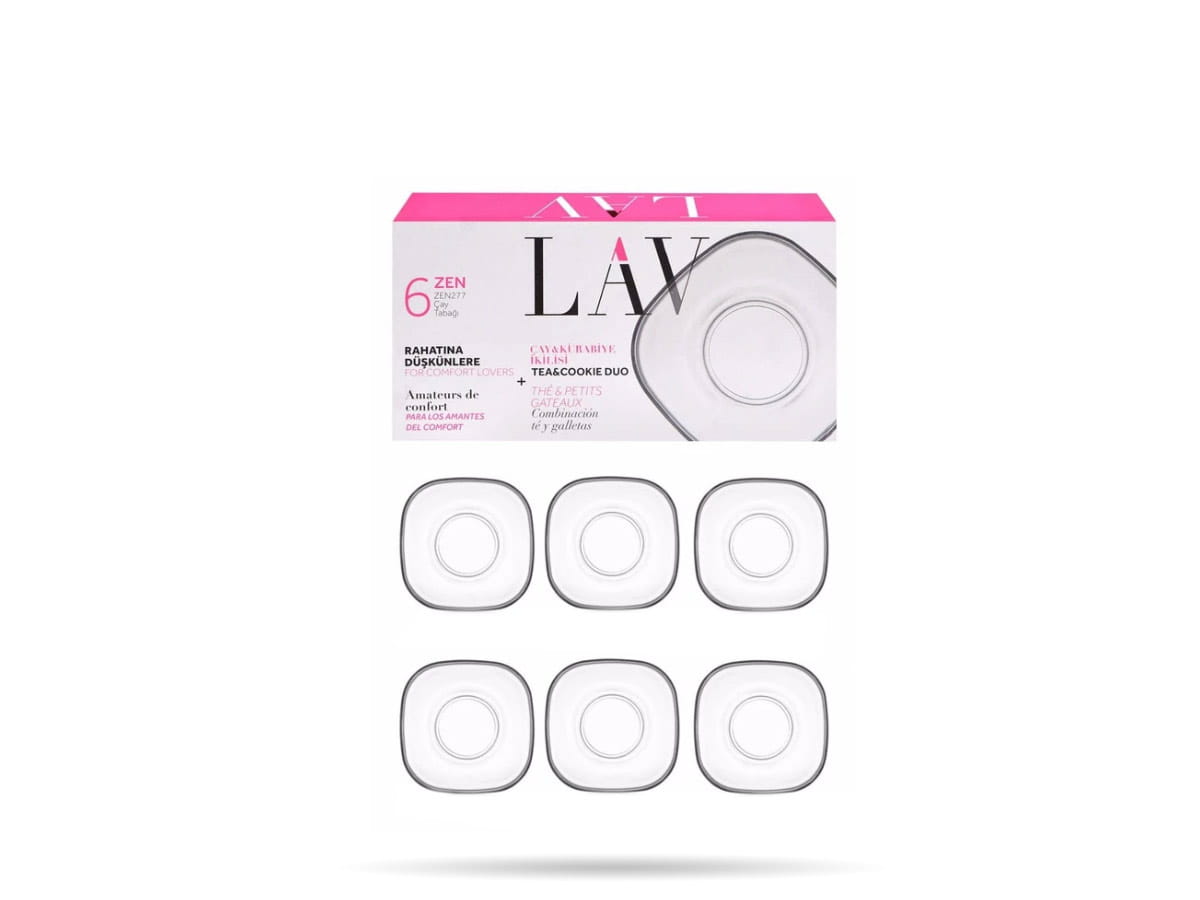 Zestaw 6 szklanych spodków o średnicy 12,5 cm z serii Zen marki LAV. Spodki o kwadratowym, obłym kształcie, wykonane z solidnego szkła sprawdzą się do użytku pod filiżanki lub bulionówki. Mogą służyć jako talerzyki do ciasta. Seria Zen marki LAV to propozycja zarówno do domowego użytku, jak i w profesjonalnej gastronomii.
