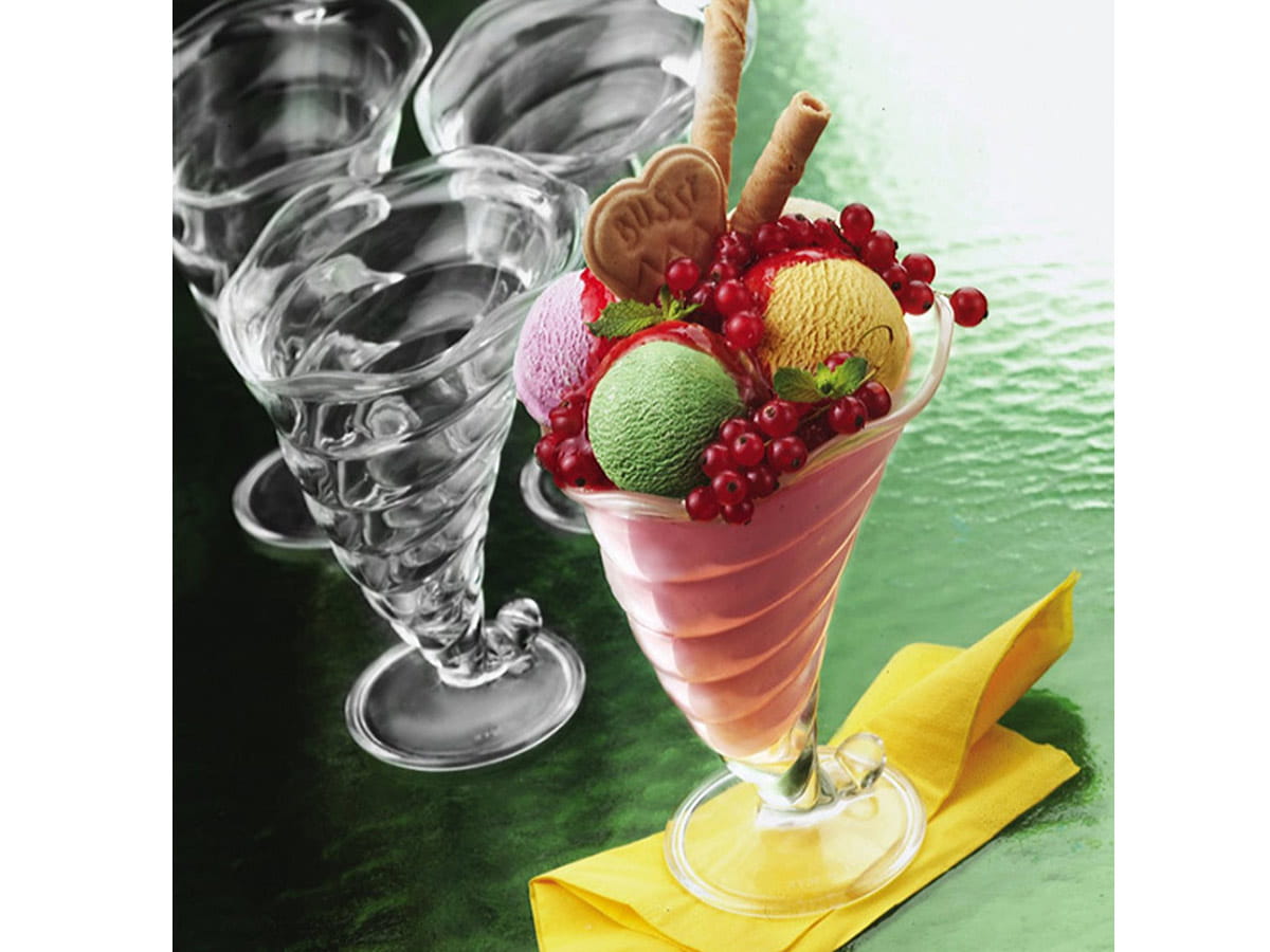 Pucharki deserowe Fortuna Bormioli Rocco. Fantazyjnie zakręcone pucharki do lodów i deserów efektownie wyeksponują serowowane dania.