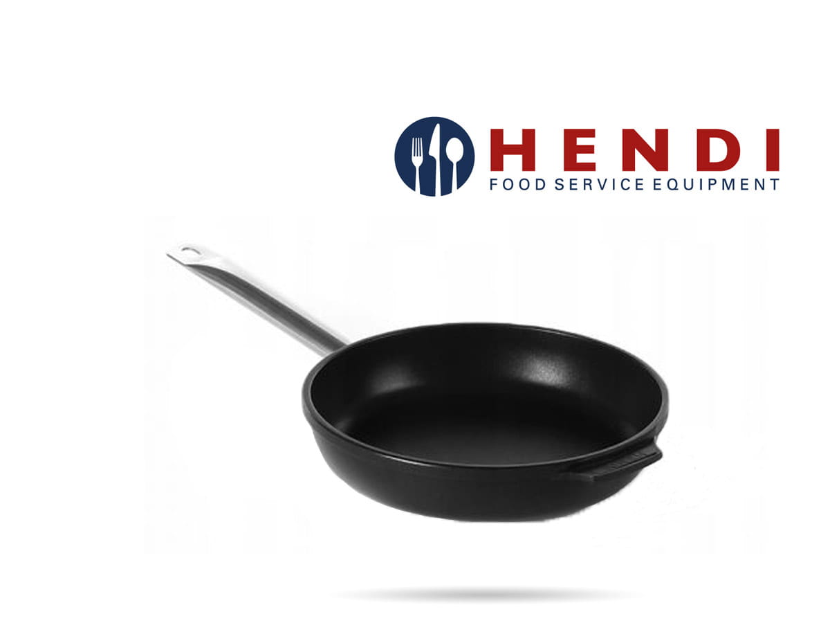 Uniwersalna patelnia wykonana z odlewu aluminium powlekana tytanem, świetnie nadaje się zarówno do profesjonalnej kuchni, jak i do użytku domowego. Patelnie Hendi charakteryzują się wysoką jakością, zapobiegającą przywieraniu potraw, gotowanie na nich, to czysta przyjemność, a zmywanie nie sprawia trudności.