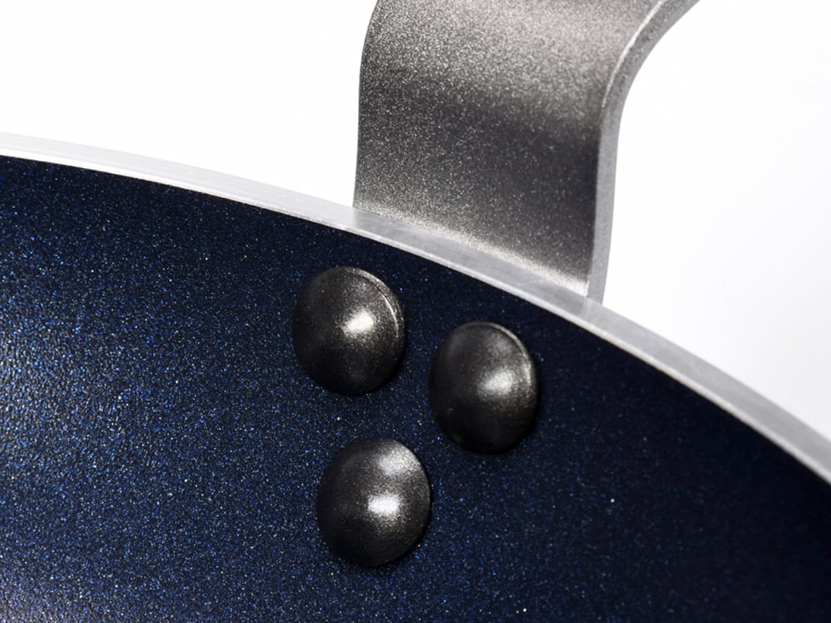Uchwyt patelni, rękojeść wykonano ze stali epoksydowanej, jest połączona z roboczą częścią patelni 3 nitami.