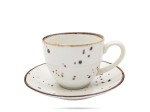 Poręczna filiżanka o pojemności ml, ze spodkiem o średnicy 16,2 cm, z serii Cottage Cream firmy Porcelana Bogucice. Seria Cottage w kolorze Cream to linia ciepłej, kremowej porcelany z nieregularnymi, ciemnymi i nakrapianymi wzorami. Takie wzornictwo dodaje charakteru i niepowtarzalnego wyglądu. Jakość porcelany pozwala na bezpieczne mycie jej w zmywarkach, a także na stosowanie jej w kuchenkach mikrofalowych.