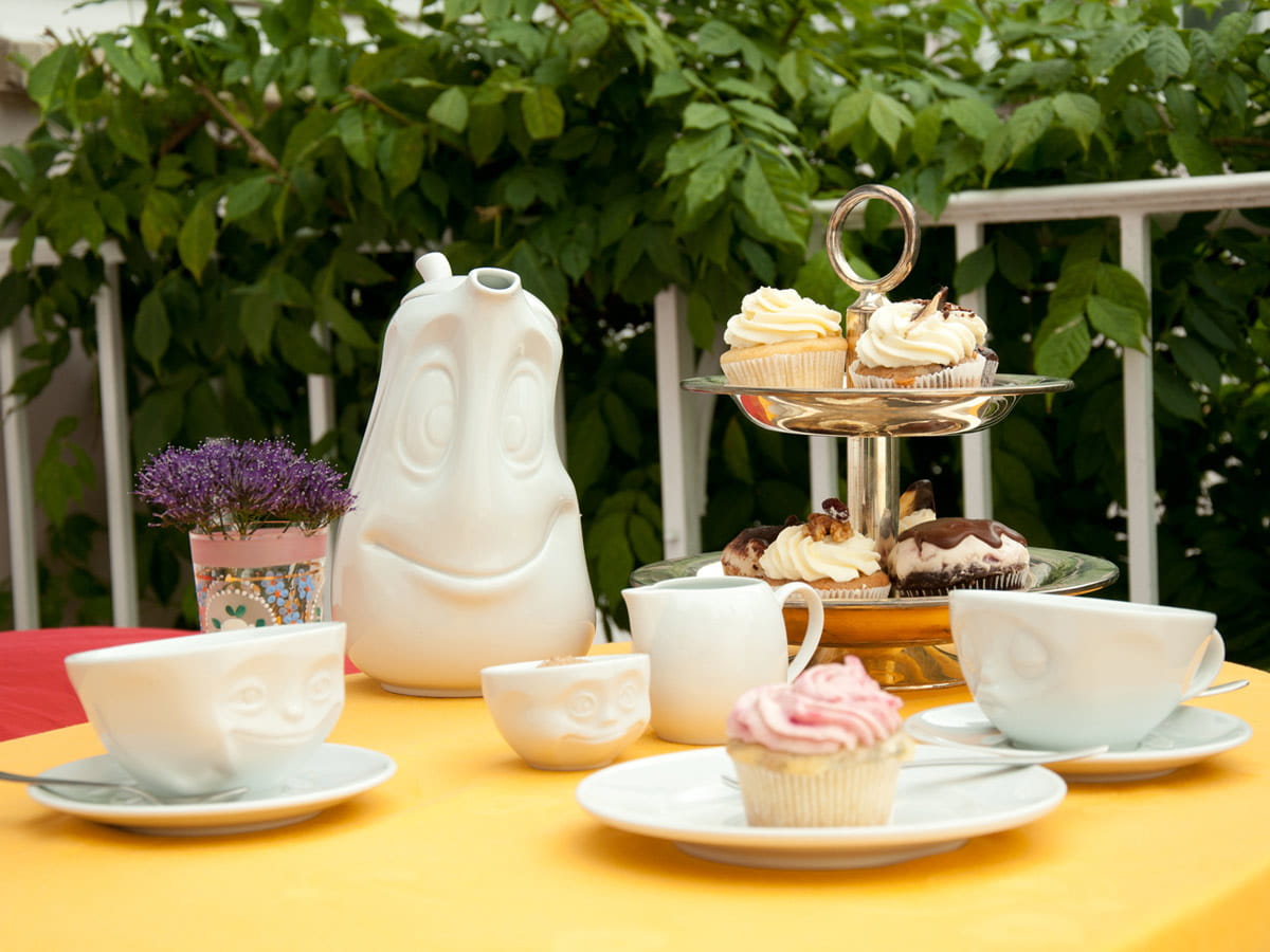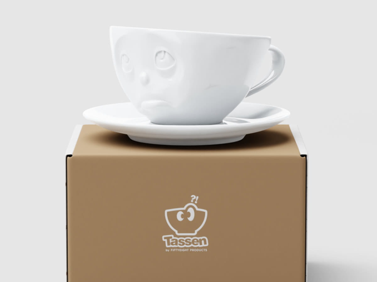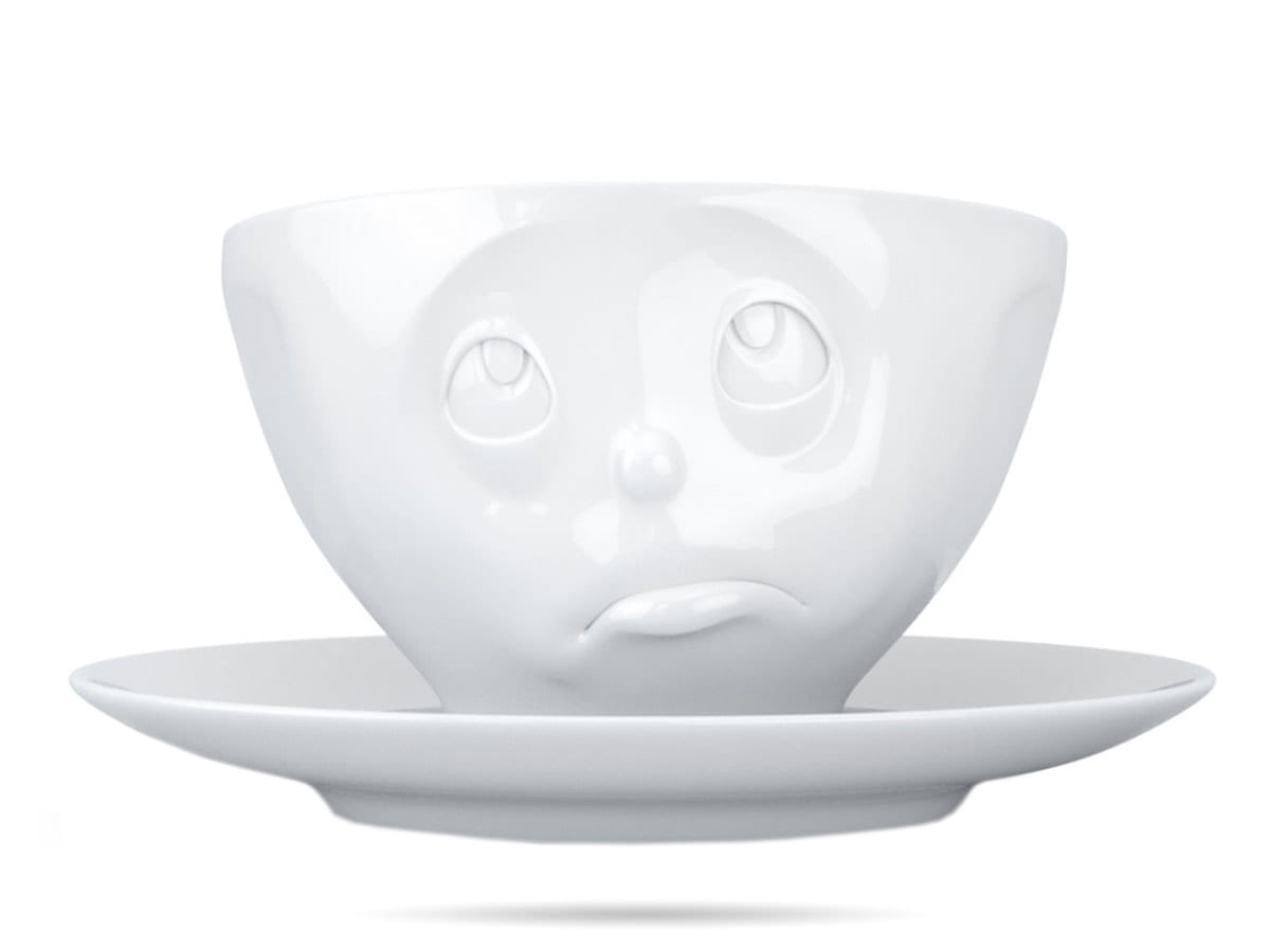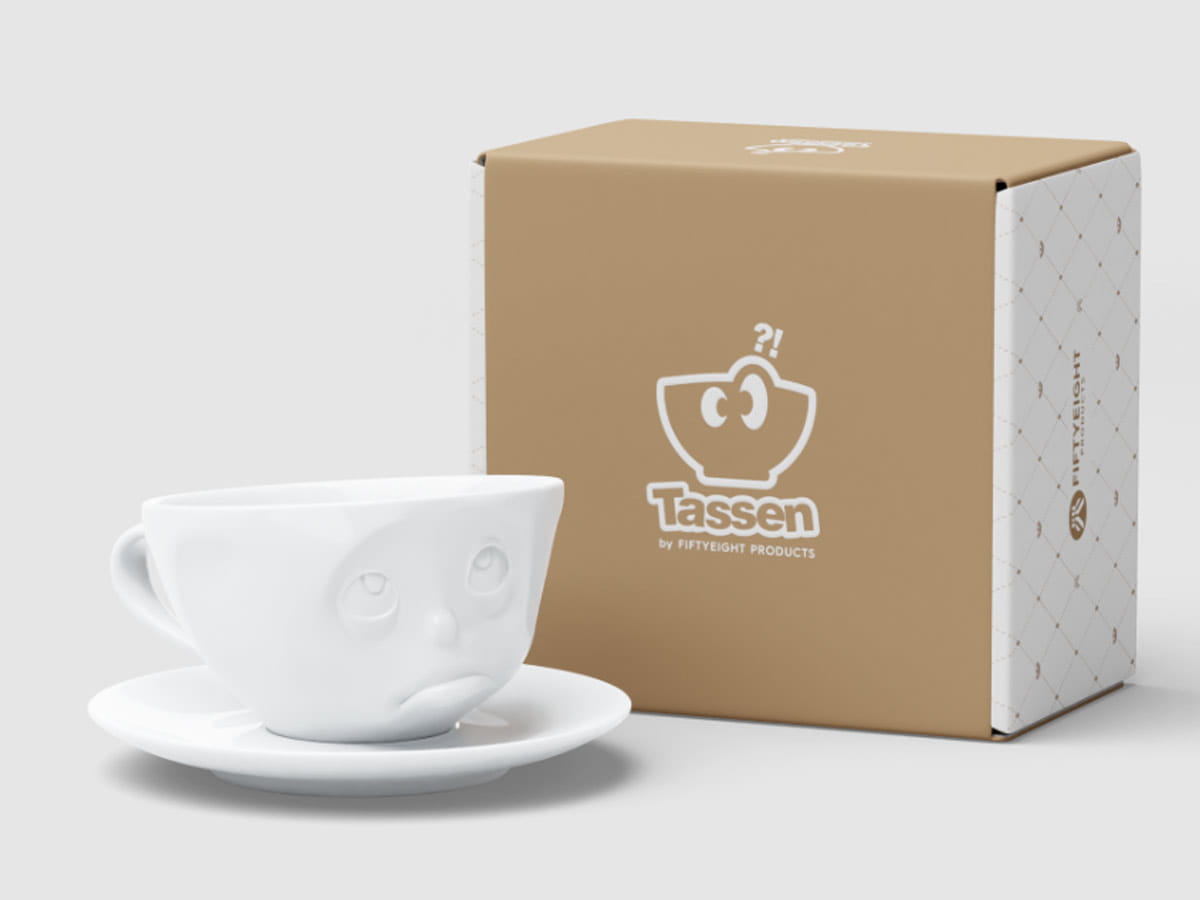 Filiżanka ze spodkiem 58Products. Tassen to linia wysokiej jakości porcelany z zabawnymi, wypukłymi buźkami. Ciekawa filiżanka do kawy, herbaty to świetny pomysł na prezent.