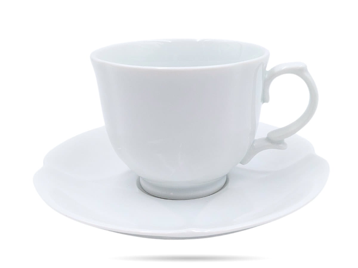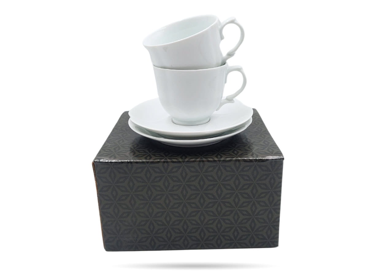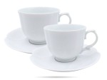 Białe filiżanki ze spodkami, wykonane z wysokiej jakości porcelany. Eleganckie, z praktyczną pojemnością - zachwycą każdego miłośnika kawy i herbaty.