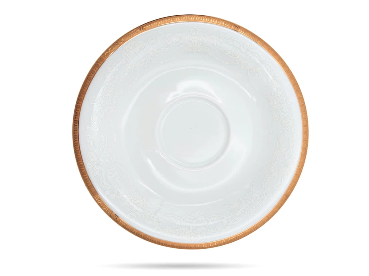 Białe filiżanki ze spodkiem, ozdobione białym i złotym wzorem. Eleganckie, stabilne, praktyczne - idealne na porcję ulubionej kawy lub herbaty.