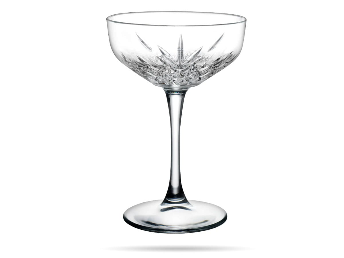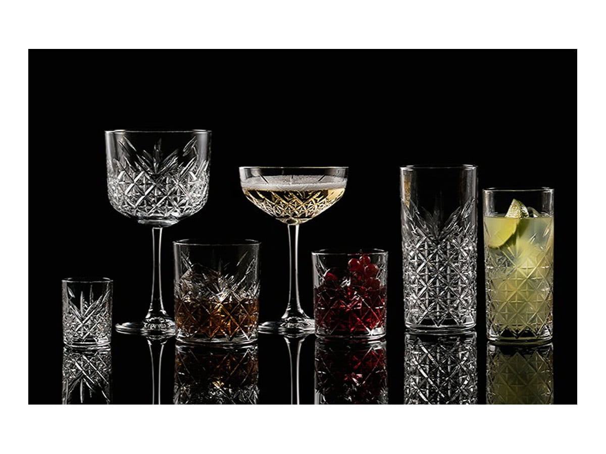 Kieliszek do szampana zdobiony wzorem ciętego szkła, przypominającym kryształ. Timeless pięknie rozprasza światło i efektownie eksponuje zawartość. Szeroka czarka, smukła nóżka i stabilna stopa sprawiają, że kieliszek jest wygodny w użyciu.