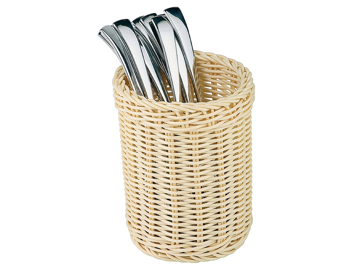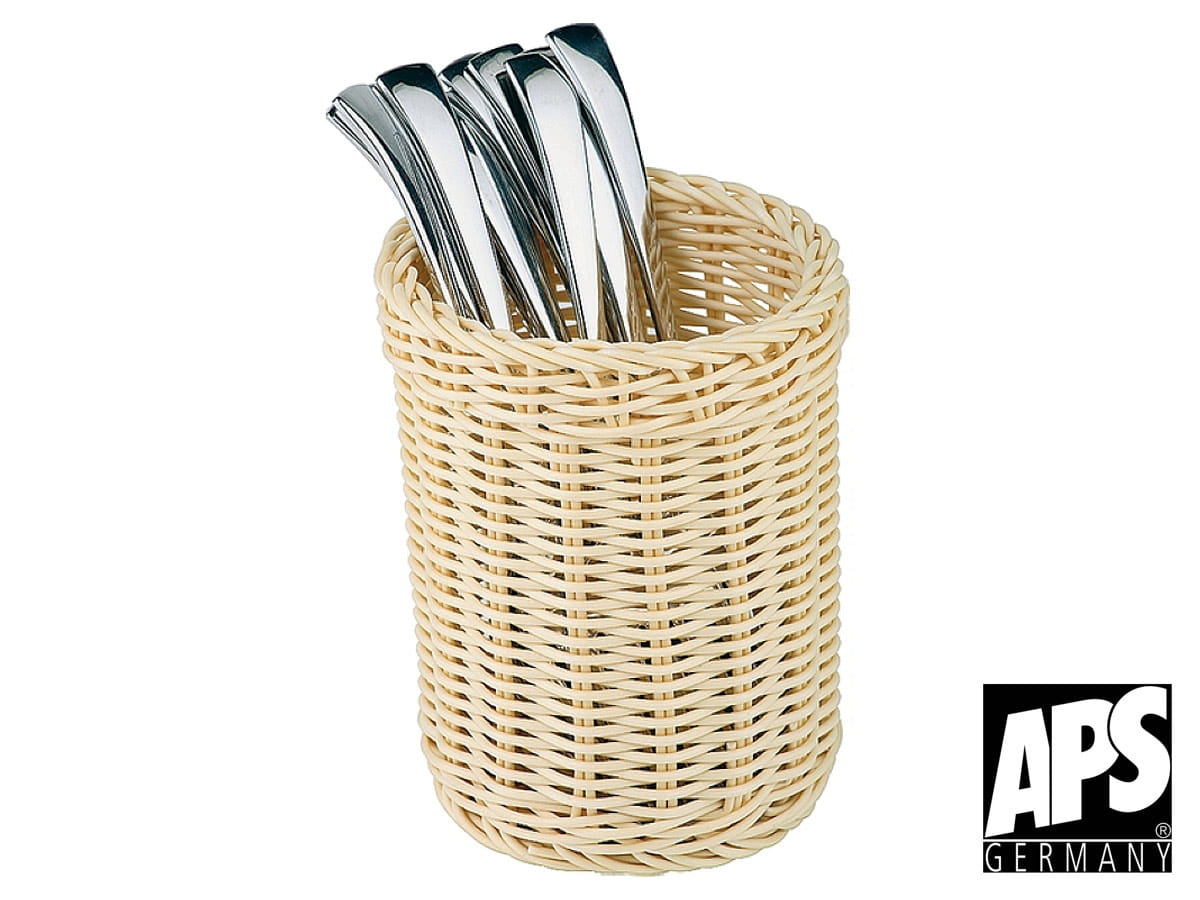 Koszyk na sztućce z polipropylenu APS. Mocny i trwały koszyk z bezpiecznego tworzywa imitującego wiklinę. Zapewnia estetyczne przechowywanie sztućców, świetnie sprawdza się w gastronomii. APS oferuje koszyki na sztućce w różnych kształtach i kolorach.