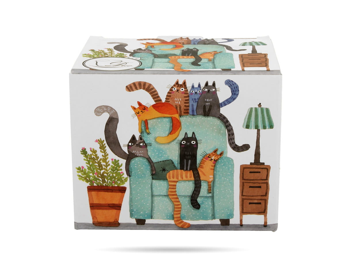 Kubek baryłka zdobiony kolorowym motywem Koci świat - koty w fotelu. Przedstawia urocze koty siedzące w fotelu. Wykonany z porcelany New Bone China - lekkiej, ale także mocnej i trwałej.