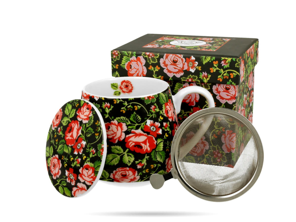 Kubek baryłka zdobiony kwiecistym motywem na czarnym tle. Wykonany z porcelany New Bone China - lekkiej i mocnej. W zestawie z pokrywką i praktycznym zaparzaczem.