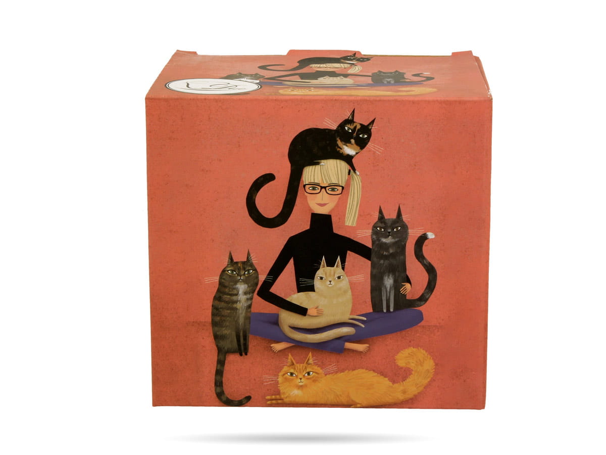 Kubek baryłka zdobiony kolorowym motywem Koci świat Cindy i koty. Przedstawia dziewczynę otoczoną uroczymi kotami na pomarańczowym tle. Wykonany z porcelany New Bone China - lekkiej, ale także mocnej i trwałej. Kubek w zestawie z praktycznym zaparzaczem i porcelanową pokrywką.