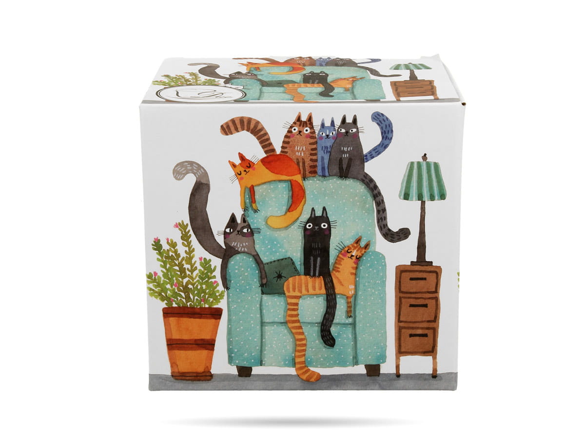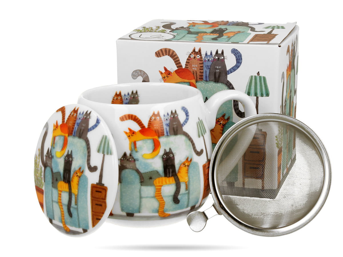 Kubek baryłka z zaparzaczem DUO - Koci świat - koty w fotelu. Kubek do kawy herbaty, który zachwyci każdego miłośnika kotów. Kubek z porcelany dłużej utrzymuje ciepło. W zestawie dołączony jest zaparzacz i porcelanowa pokrywka. Kubek w ozdobnym pudełku to gotowy pomysł na prezent.