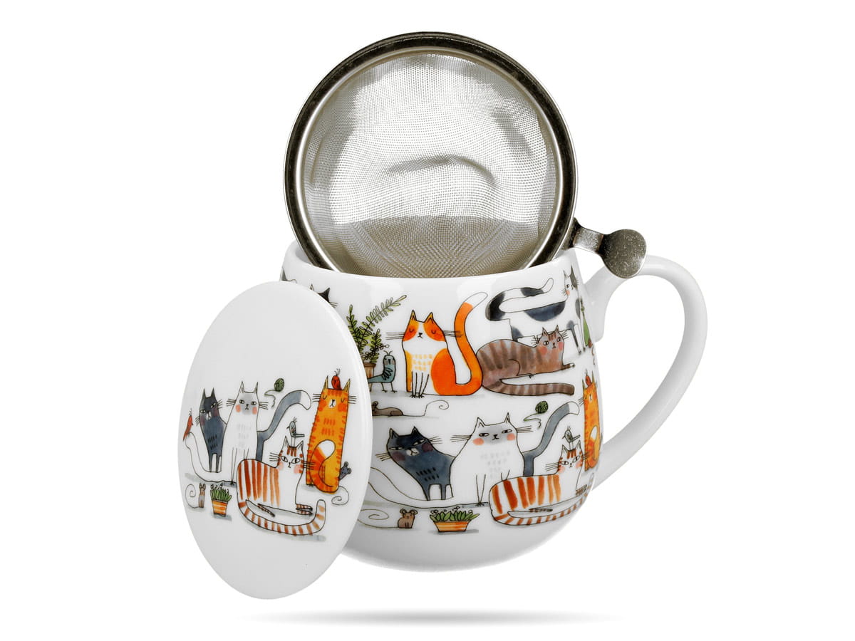 Kubek baryłka zdobiony kolorowym motywem leniwych kotów. Wykonany z porcelany New Bone China - lekkiej i mocnej. W zestawie z praktycznym zaparzaczem i pokrywką.