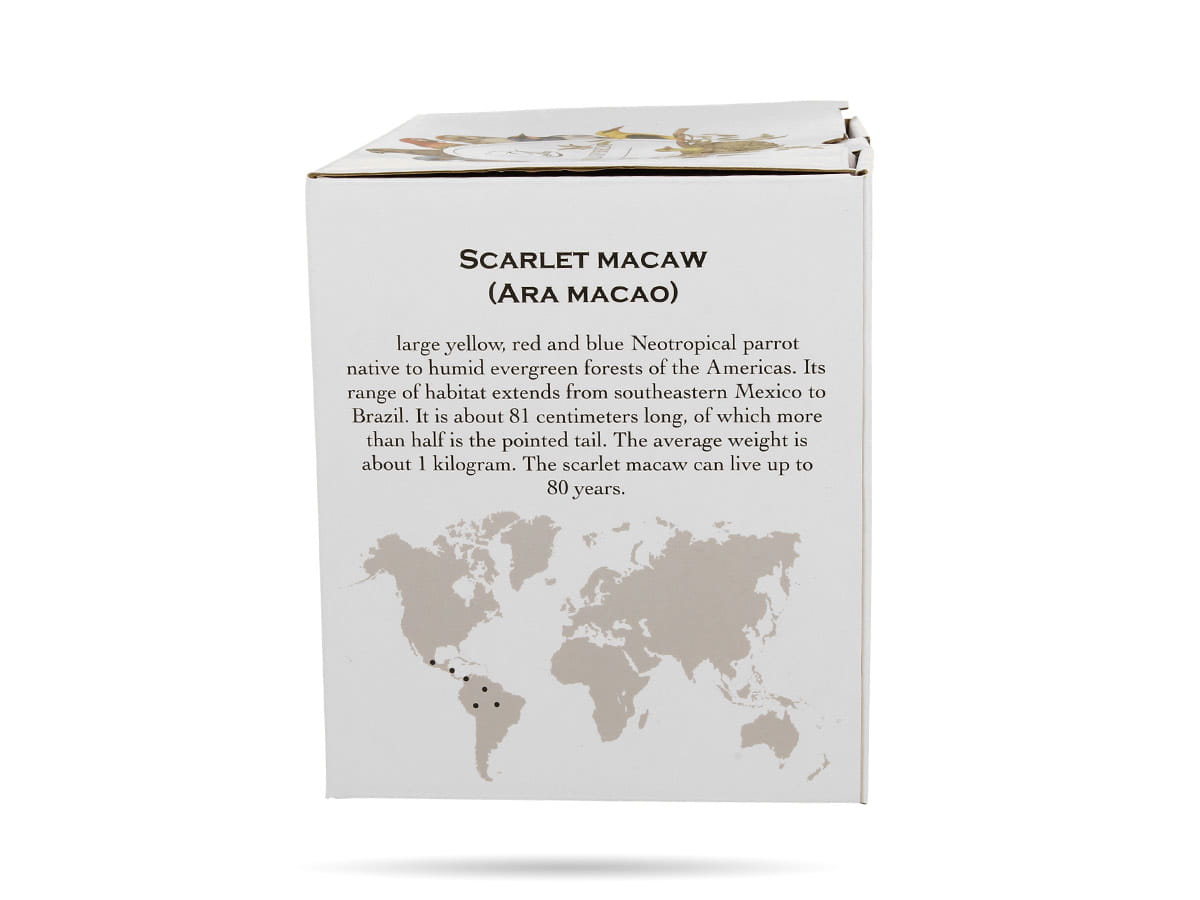 Kubek Papugi Duo. Kubek do kawy, herbaty. Klasyczny kształt, wygodny uchwyt, stabilne dno. Kubek zdobi barwna grafika serii Ptasi świat Duo - papugi Ara szkarłatne. Zapakowany w ozdobne pudełko, stanowi gotowy pomysł na prezent.