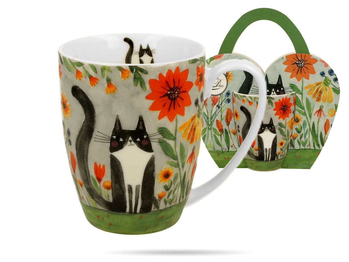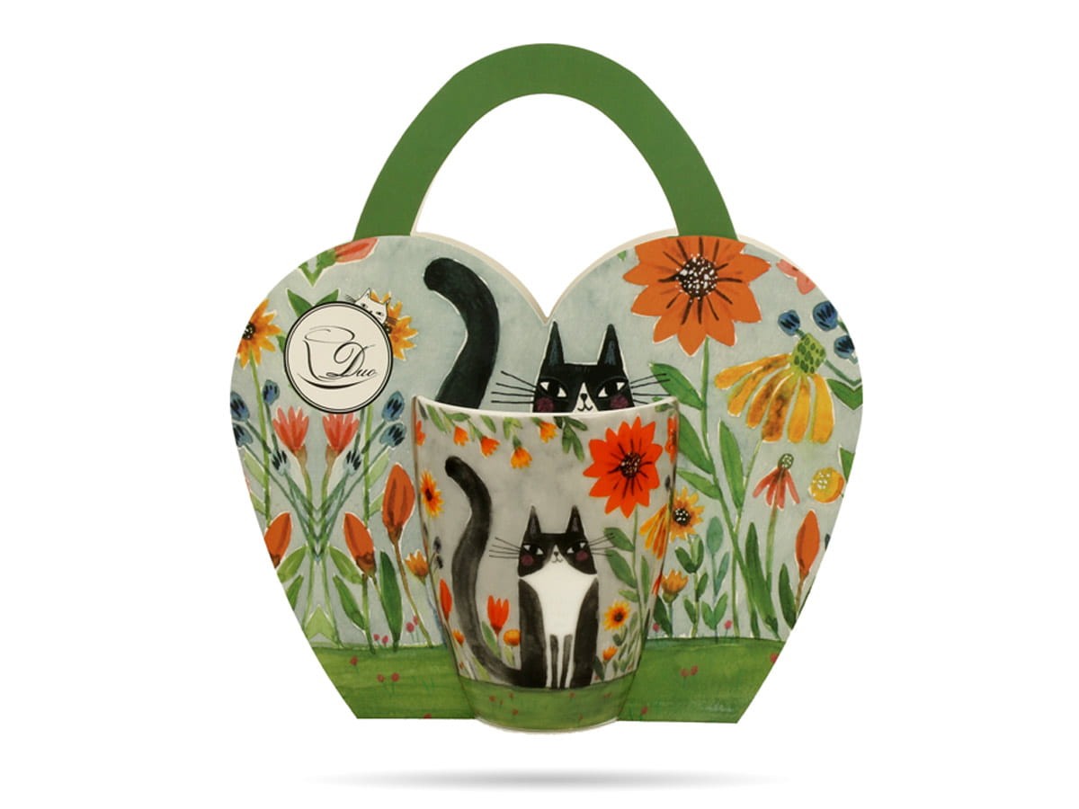 Kubek w koty DUO. Porcelanowy kubek z barwnym motywem kota na łące. Idealny kubek do ulubionej kawy i herbaty. Kubek Duo w ozdobnym opakowaniu to gotowy prezent, który może trafić wprost do rąk obdarowywanej osoby.