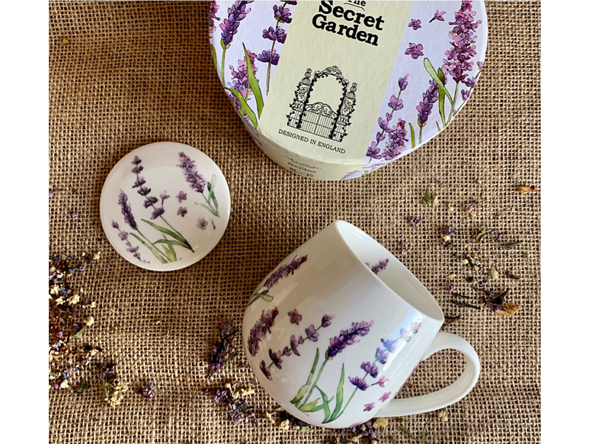 Porcelanowy kubek o pojemności 430 ml ze stalowym zaparzaczem i pokrywką zdobiony motywem kwiatów lawendy.