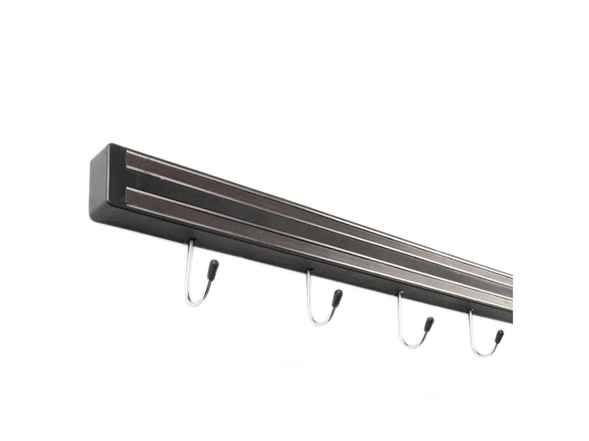 Listwę wyposażono w 5 haczyków, na których dodatkowo można zawiesić przybory kuchenne. Listwę wykonano z polipropylenu i wyposażono w 2 magnetyczne paski o długości 45 cm każdy.