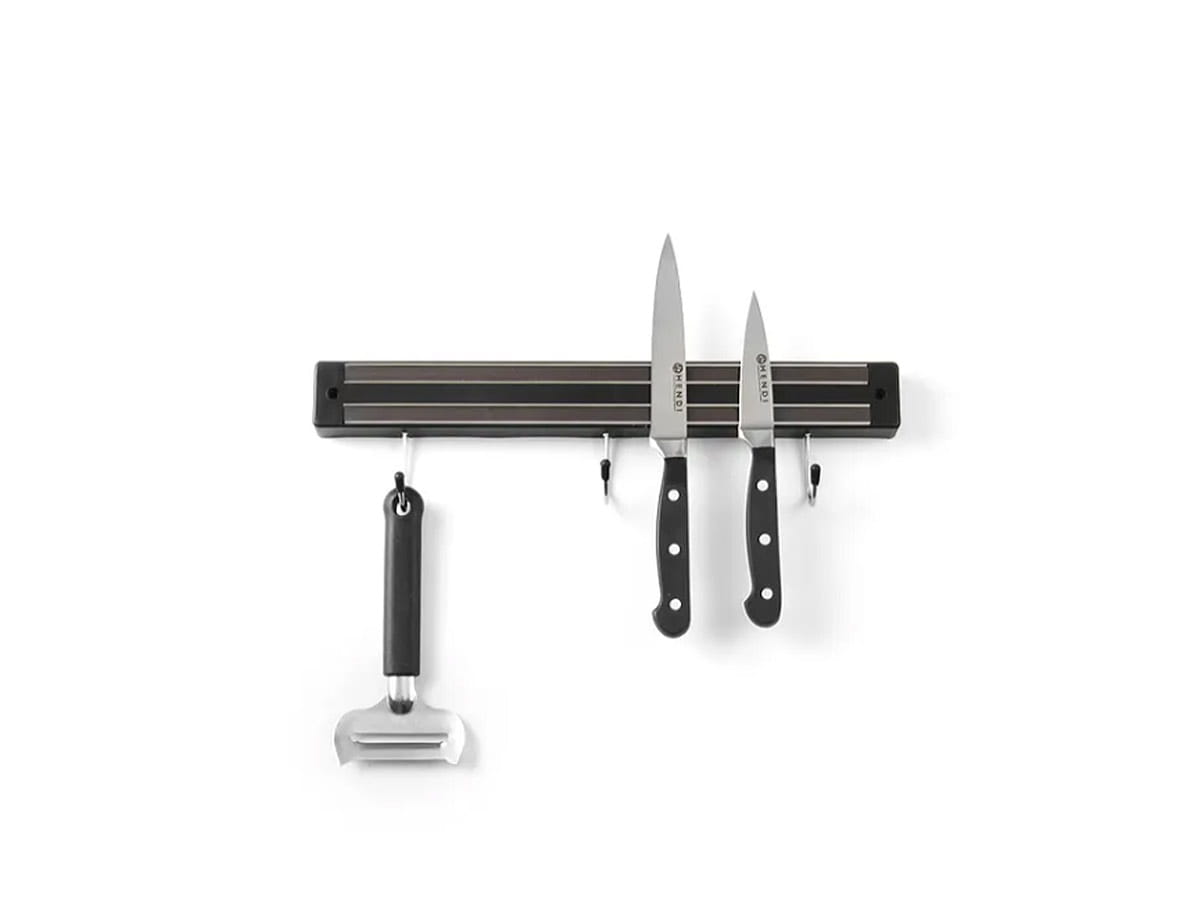 Listwa magnetyczna z haczykami o długości 45 cm marki Hendi. Listwa magnetyczna pozwala na lepszą organizację i porządek w kuchni.