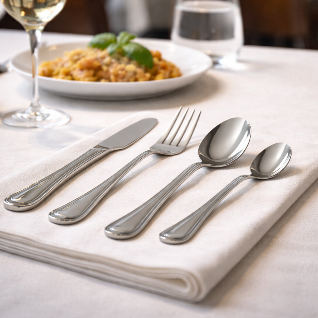 Sztućce Bologna Amefa wykonano z wysokiej jakości stali nierdzewnej chromowanej 18/0 - dzięki temu są trwałe i odporne na uszkodzenia. Polerowanie, z subtelnym zdobieniem sztućce świetnie sprawdzą się zarówno w gastronomii, jak i w domowym użytku.