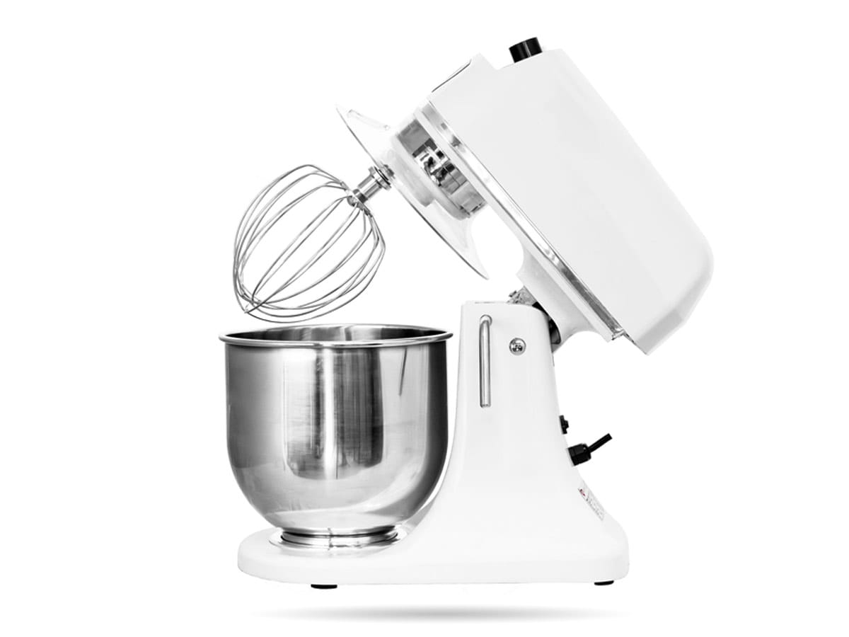 - w zestawie dzieża z wygodnym uchwytem, hak, mieszadło płaskie i rózga ze stali nierdzewnej, dzięki którym przygotujesz różnego rodzaju ciasta, kremy i inne wypieki
