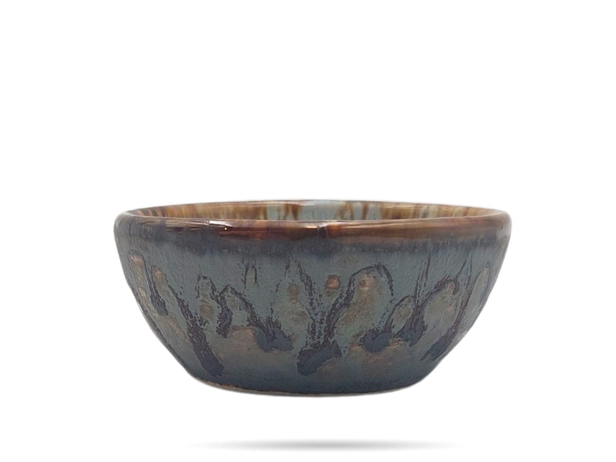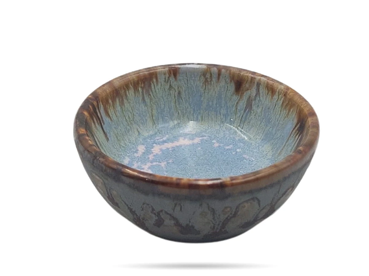 Miseczka na dipy, sosy z serii Kerative Kera Ceramika - połączenie tradycji i nowoczesnego designu. Naturalna, błękitna barwa, szkliwione spękana na wierzchniej części, mat na spodzie i bokach, tworzą niebanalną kompozycję. Doskonale sprawdzi się w gastronomii: do restauracji, hoteli, karczm lub pizzerii.