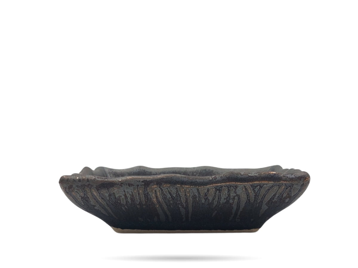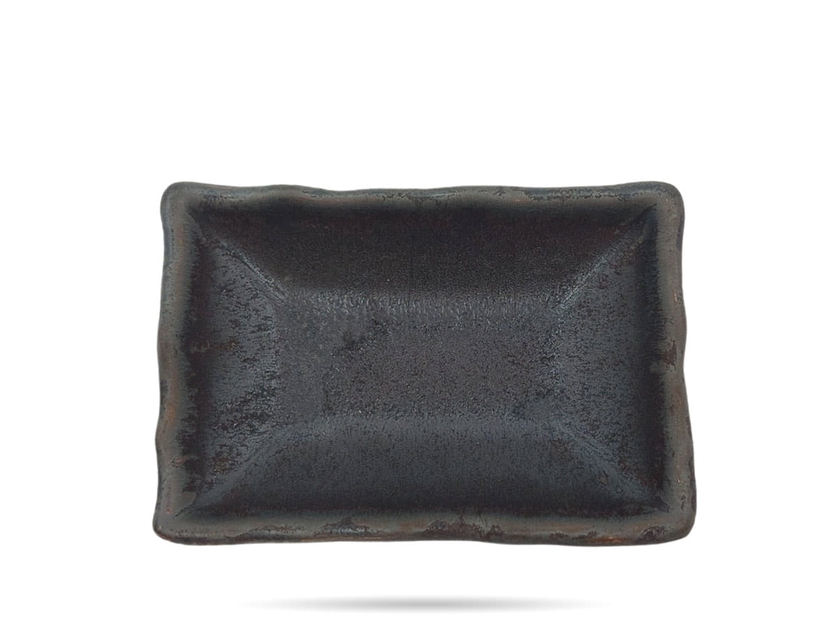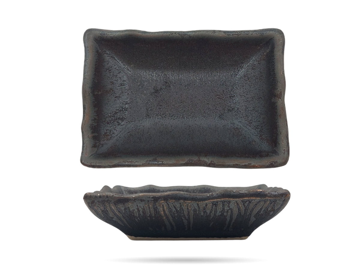 Naczynie na dipy Hematyt Kera Ceramika. Prostokątne naczynie na sosy, dipy, dodatki, zdobione przetarciami i drewnianym wzorem Moku. Hematyt to seria oryginalnie zdobionych naczyń w surowej, brązowej barwie. Częściowo szkliwionej, częściowo matowej. Kera Ceramika to funkcjonalne i mocne naczynia, które przykuwają wzrok swoją nieoczywistą formą i barwą.