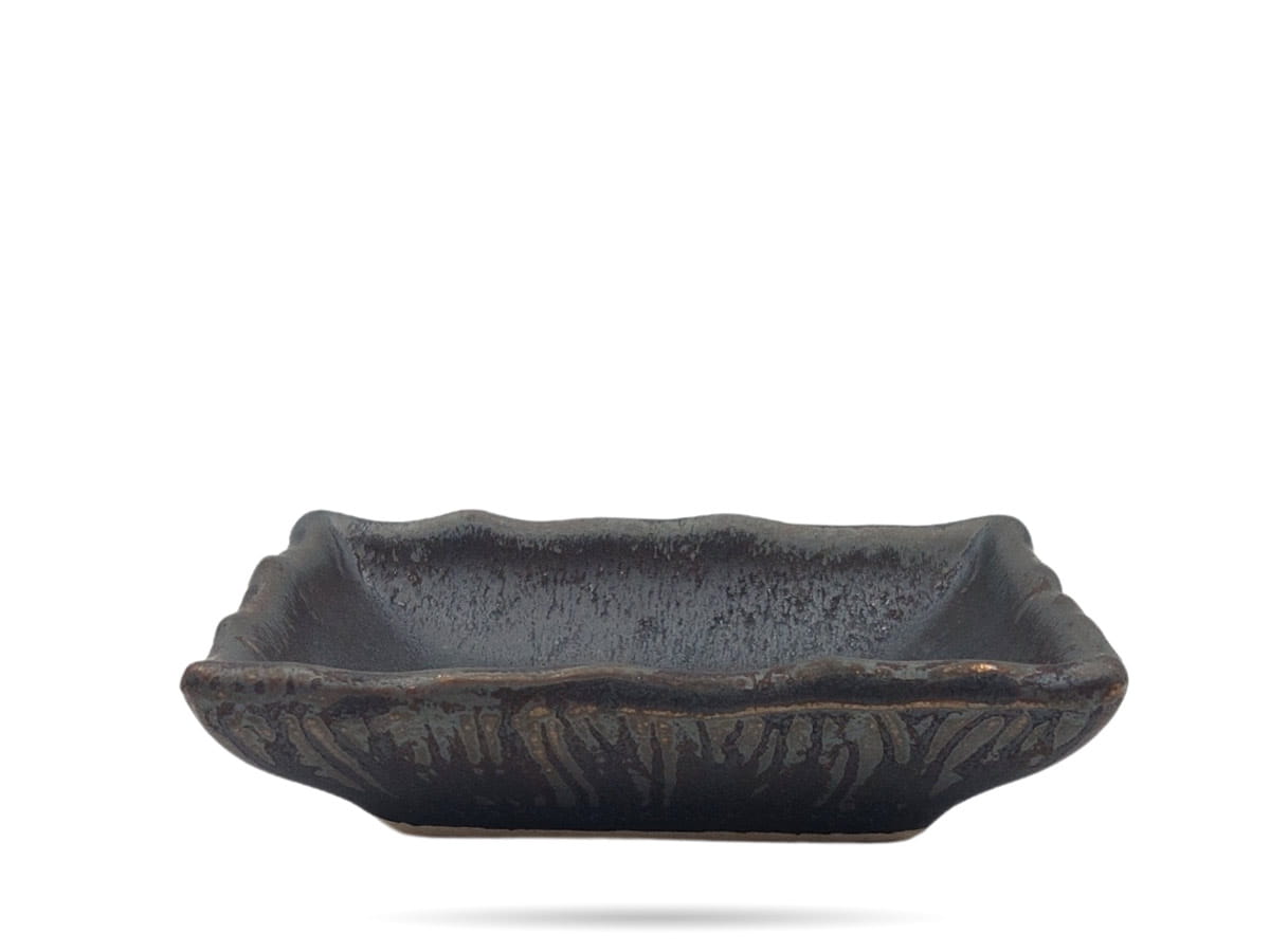 Prostokątne naczynie na dipy Kera Ceramika. Drewniane, wypukłe wzory Moku połączone z matowym brązem Hematyt tworzą ciekawą kompozycję i efektownie eksponują serwowane dania.