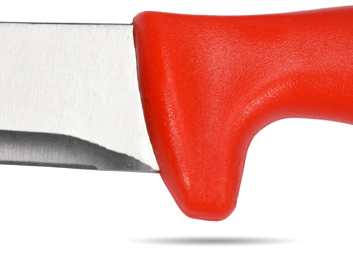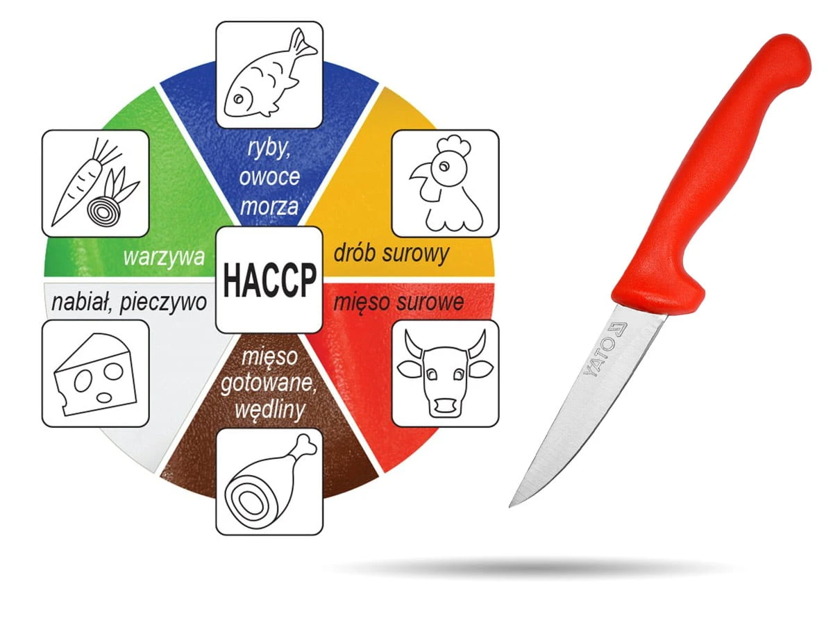 Nóż wykonany jest zgodnie z normami HACCP. Posiada czerwoną rękojeść, co oznacza, że nóż dedykowany jest do mięsa surowego.