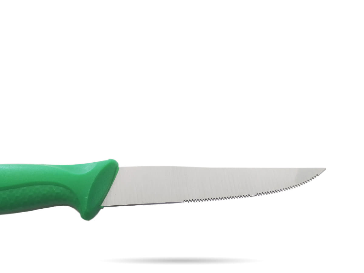 Nóż z zieloną rączką o ząbkowanym ostrzu długości 10 cm. Wykonany z wysokiej jakości materiałów. Idealny do gastronomi i użytku domowego