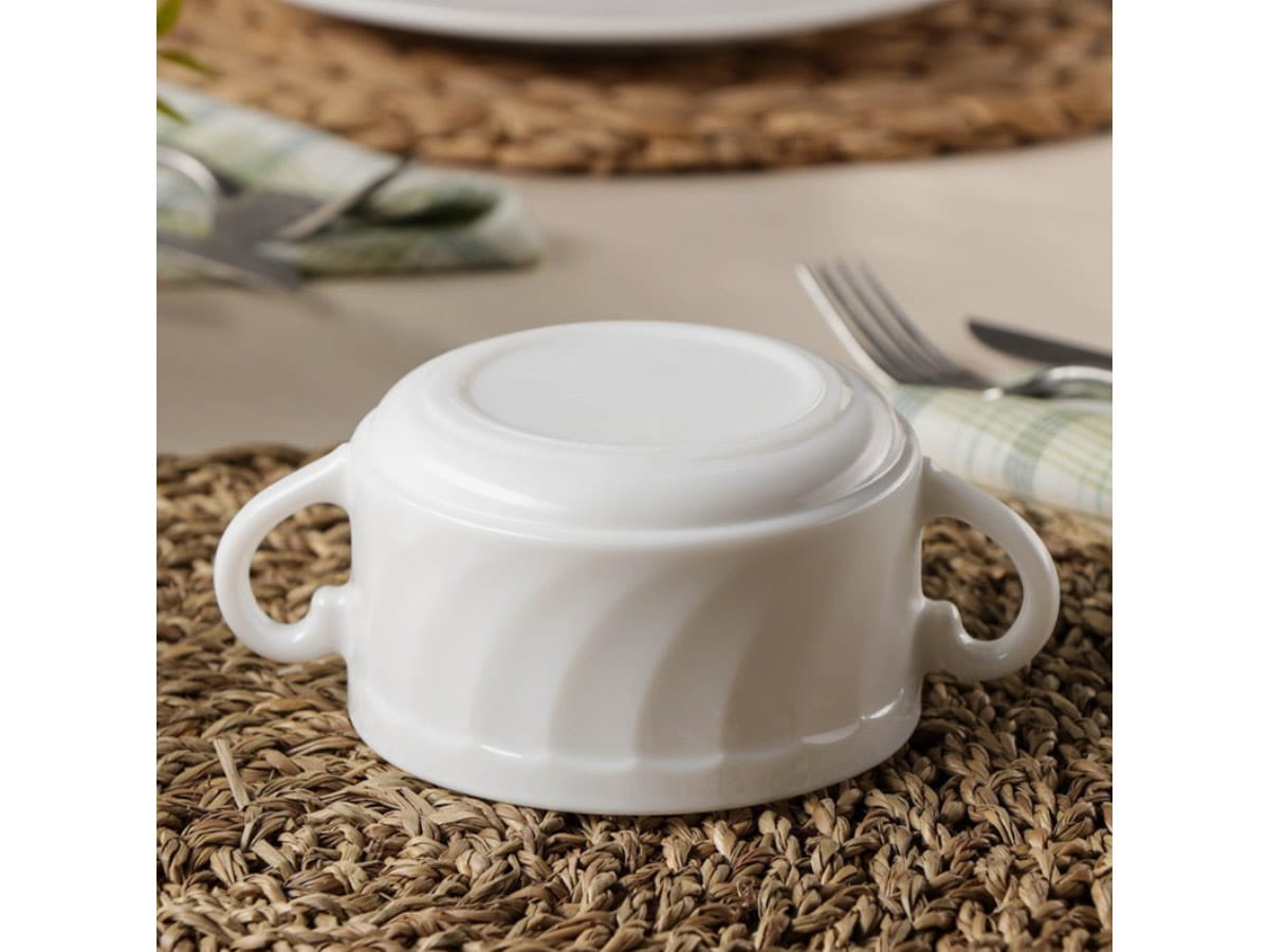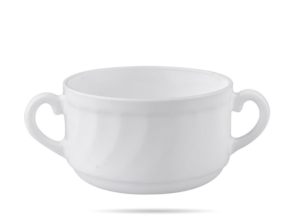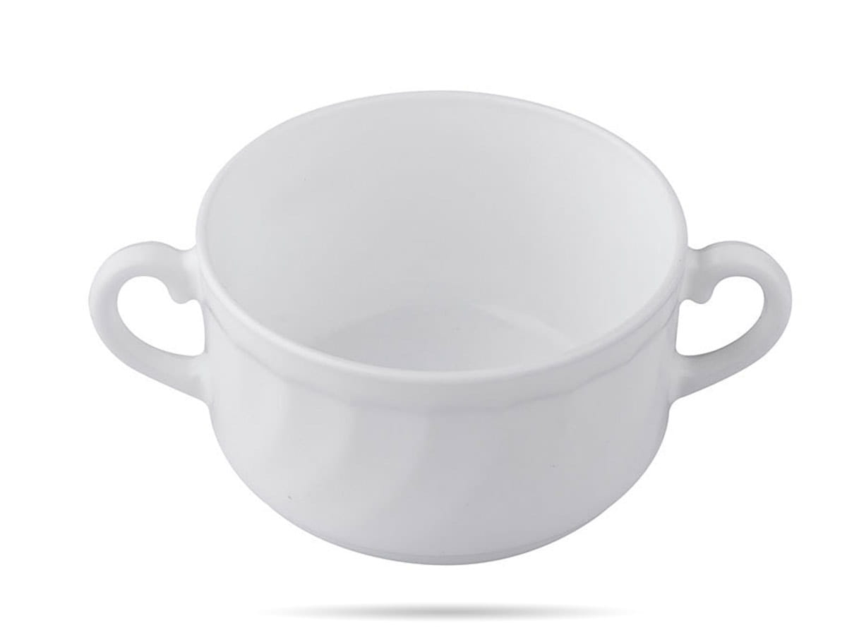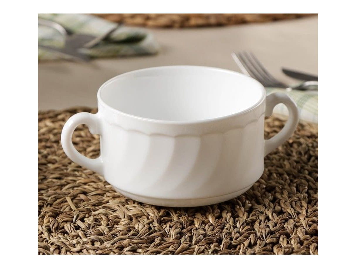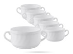 Bulionówki Trianon Luminarc. Salaterki z uchwytami, flaczarki, miseczki do zup, kremów i innych dań. Trianon Luminarc to mocne i lekkie naczynia z białego szkła hartowanego. Zdobione delikatnym, wypukłym wzorem. Salaterki bulionówki do domu i gastronomii. Zestaw zawiera 6 szt.