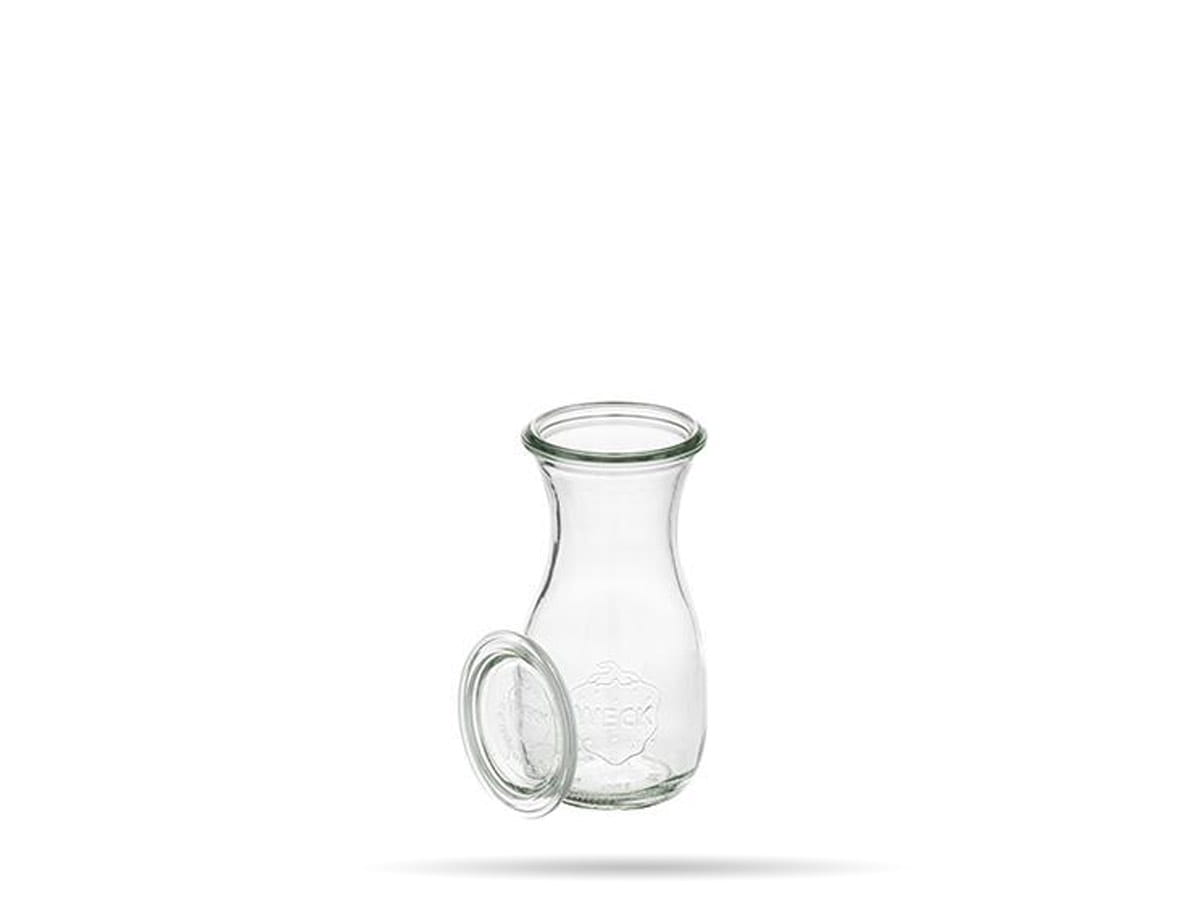 Zestaw 6 szklanych butelek WECK 250 ml z pokrywkami, idealny do serwowania soków, smoothie, dressingów i sosów. Wykonane z wysokiej jakości szkła