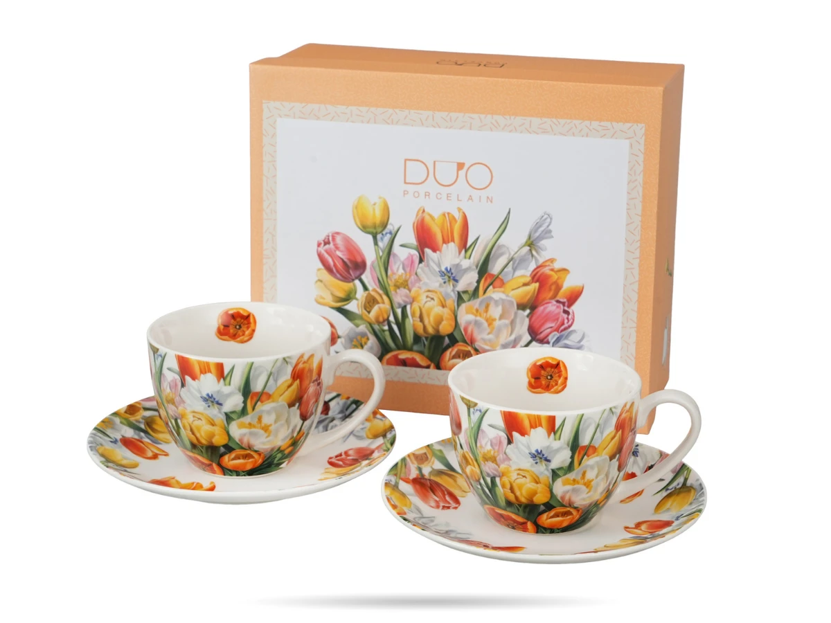 Filiżanki porcelanowe Tulipany DUO – zestaw 2 szt. ze spodkami w eleganckim opakowaniu. Idealne na prezent i do codziennego użytku.