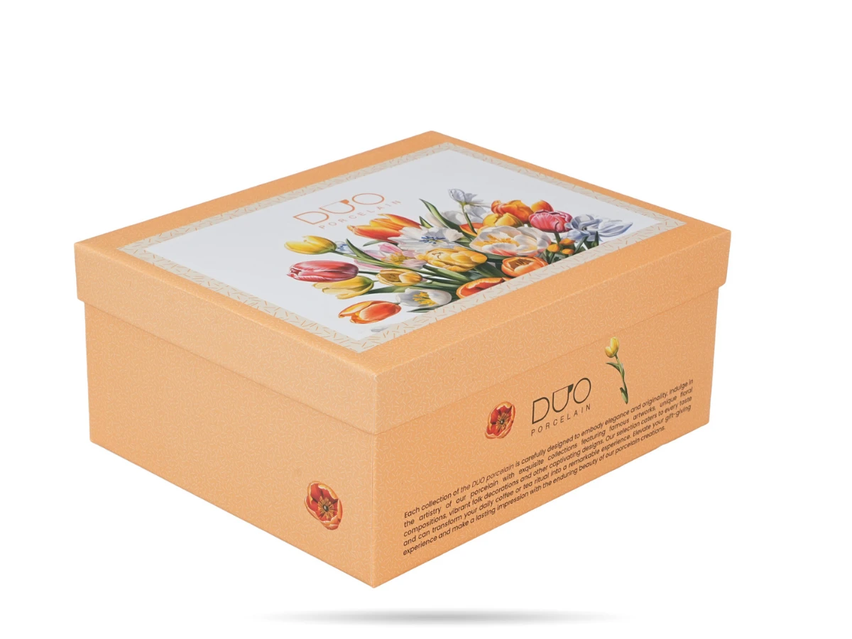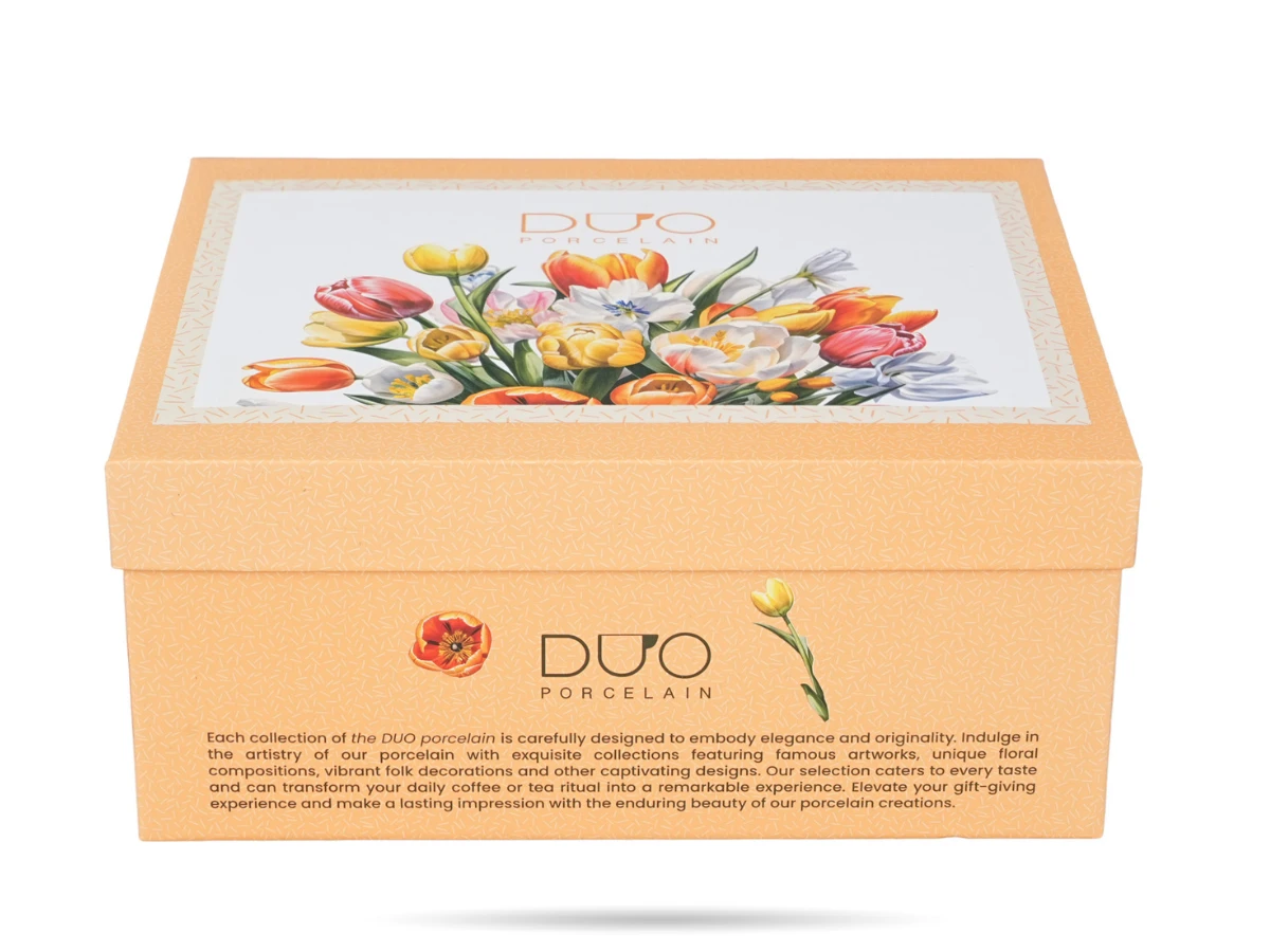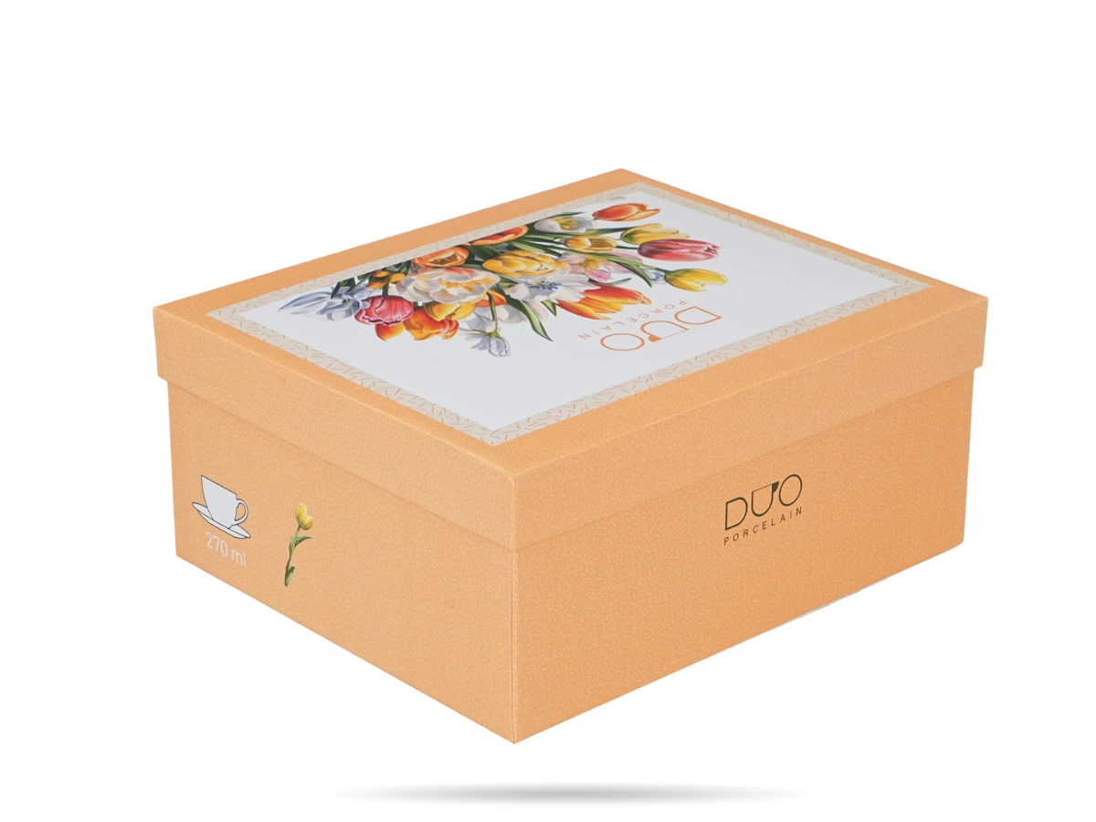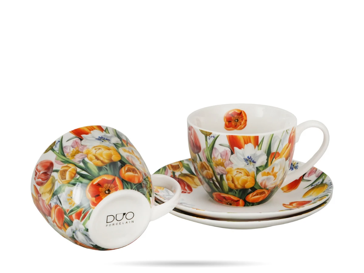 Każda filiżanka o pojemności 270 ml została ozdobiona kompozycją kolorowych tulipanów, które wnoszą do wnętrza świeżość i energię. Precyzyjne detale oraz harmonijne połączenie barw sprawiają, że zestaw doskonale prezentuje się zarówno podczas codziennych chwil przy kawie, jak i eleganckich spotkań. Filiżanki ze spodkami DUO sprawdzą się w domu, kawiarniach oraz restauracjach, gdzie liczy się estetyka serwowania.
