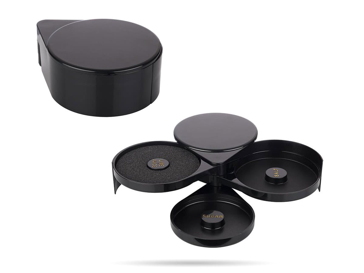 - Praktyczny podział na 3 sekcje – gąbka na sok oraz dwie komory na sól i cukier pozwalają na szybkie przygotowanie obrzeża szklanki.