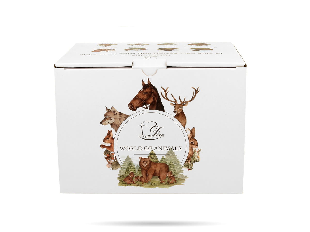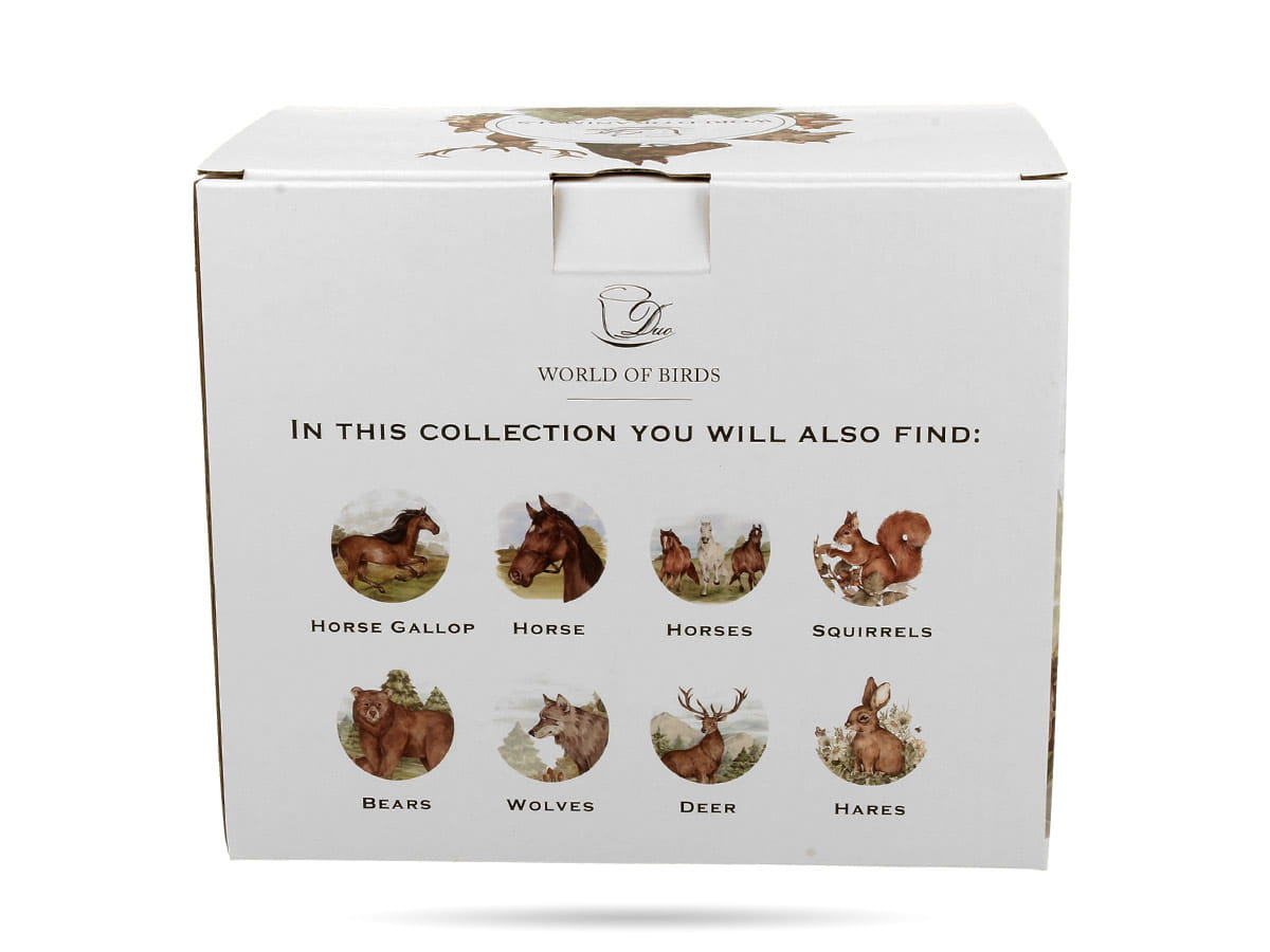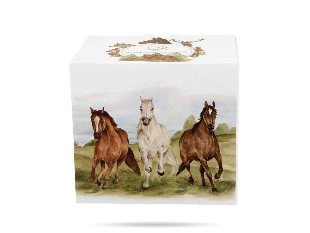Elegancki kubek porcelanowy (400 ml) z kolekcji Świat Zwierząt – Konie w galopie DUO. Wykonany z lekkiej i wytrzymałej porcelany New Bone China, z motywem galopujących koni. Zapakowany w ozdobne pudełko – idealny na prezent.