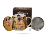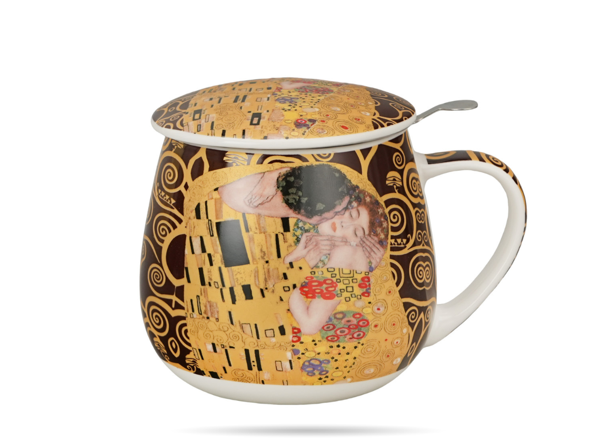 Kubek baryłka z zaparzaczem 430 ml „Pocałunek” Klimt marki DUO, wykonany z porcelany New Bone China. Stylowy kubek artystyczny z motywem słynnego obrazu Gustava Klimta to idealny wybór dla miłośników herbaty, ziół i sztuki.