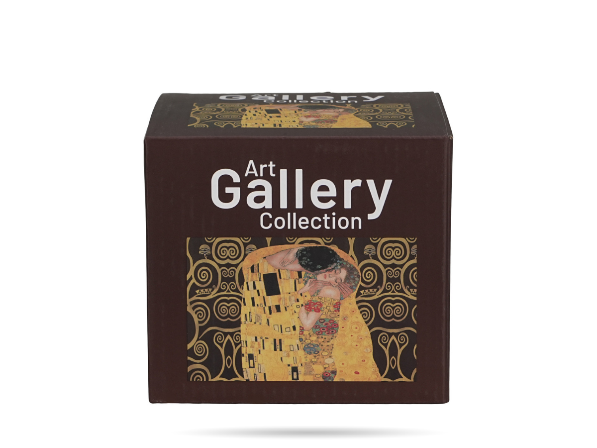 - Artystyczny design inspirowany dziełem Gustava Klimta – wnętrze i zewnętrzne ścianki zdobi reprodukcja obrazu „Pocałunek”, wprowadzając do codzienności odrobinę sztuki i luksusu.