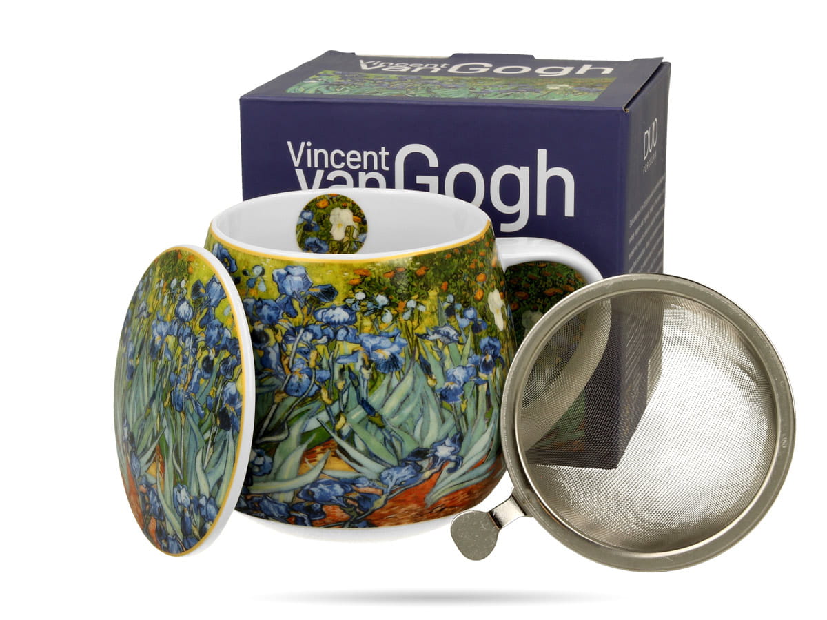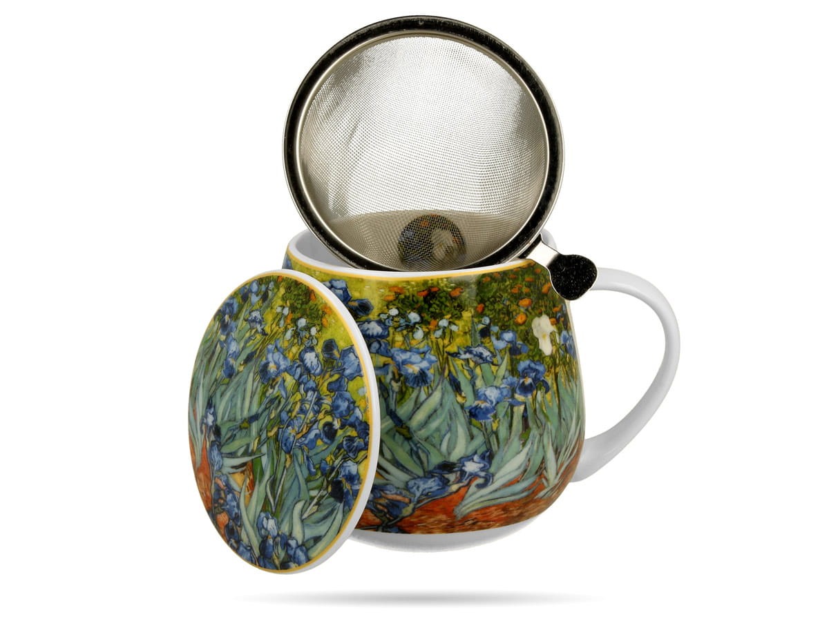 Kubek Van Gogh Duo - elegancki kubek, zdobiony motywem obrazu “Irysy” autorstwa Vincenta Van Gogha, to idealny prezent dla każdego miłośnika herbaty i kawy. Zestaw zawiera praktyczną pokrywkę i stalowy zaparzacz do ziół i herbaty.