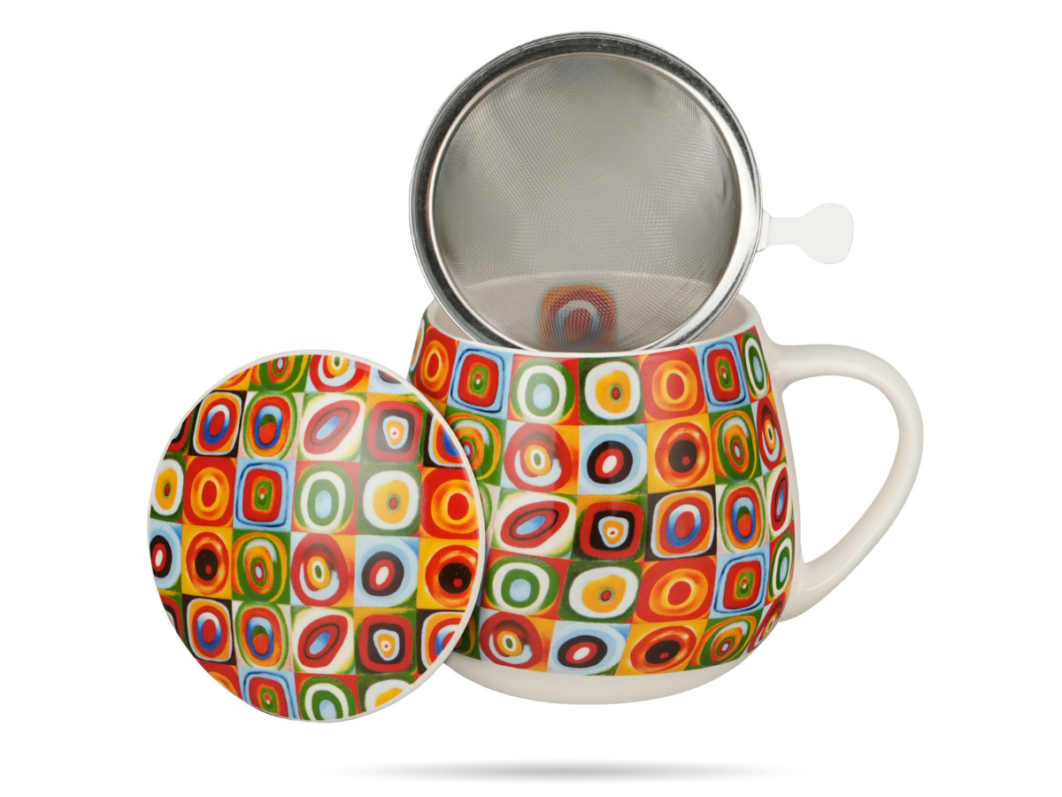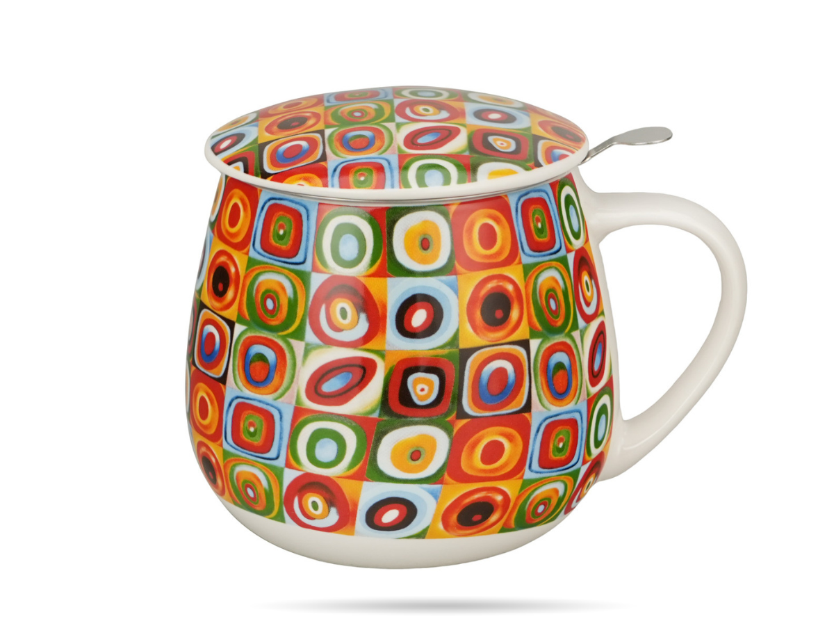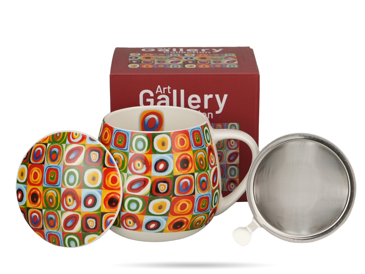 Zestaw DUO Kandinsky z serii Art Gallery – kubek baryłka z zaparzaczem i pokrywką z porcelany New Bone China, inspirowane dziełem „Kwadraty z kołami”. Idealny prezent dla miłośników sztuki i pięknego designu.