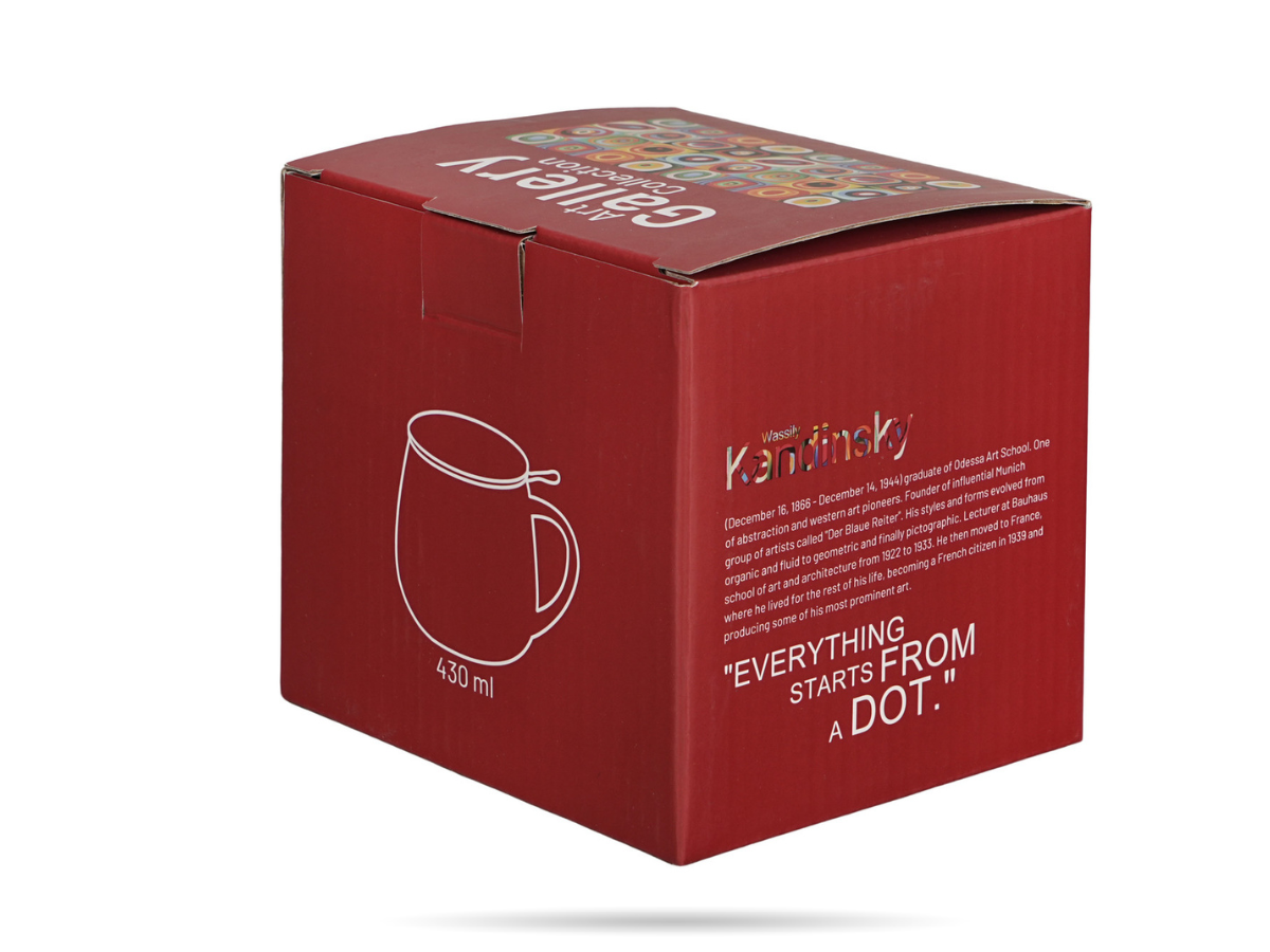 Komplet kubek baryłka z zaparzaczem DUO Kandinsky 430 ml to połączenie sztuki i funkcjonalności w najlepszym wydaniu. Wykonany z porcelany New Bone China, zestaw zachwyca eleganckim połyskiem, subtelnym kremowo-białym odcieniem i niezwykłą trwałością. Każdy kubek to małe dzieło sztuki użytkowej, inspirowane słynnym obrazem Wassilego Kandinsky’ego „Squares with Concentric Circles” z 1913 roku.