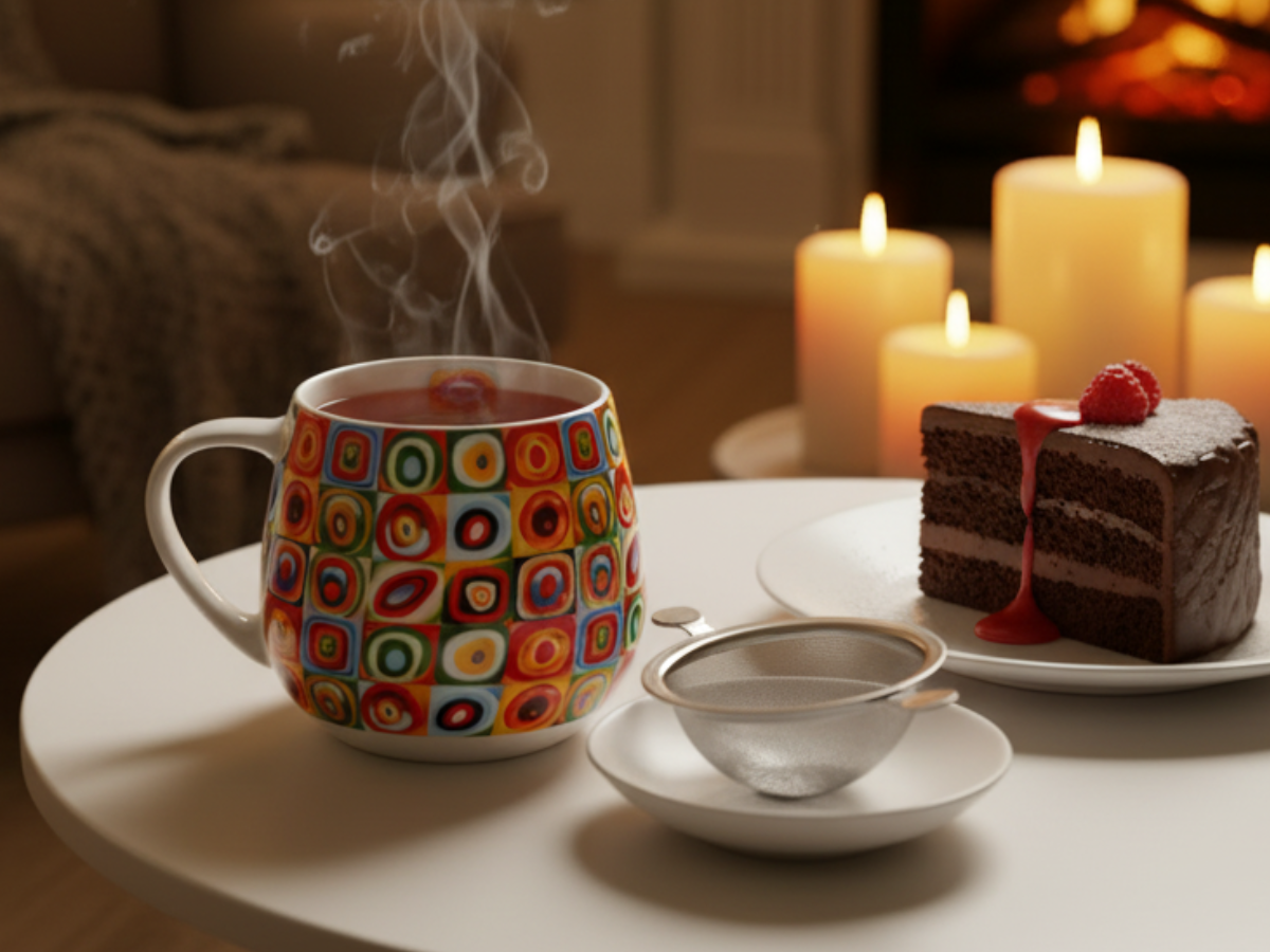 Motyw kolorowych kwadratów i koncentrycznych okręgów symbolizuje harmonię barw i energii, oddając ducha abstrakcyjnego malarstwa. Nieregularne formy i intensywne kolory tworzą niepowtarzalną kompozycję, która dodaje wnętrzu artystycznego charakteru. Zestaw składa się z porcelanowego kubka (430 ml), pokrywki i zaparzacza, zapakowanych w ozdobne pudełko z tym samym motywem – idealny pomysł na prezent dla miłośników sztuki i designu.