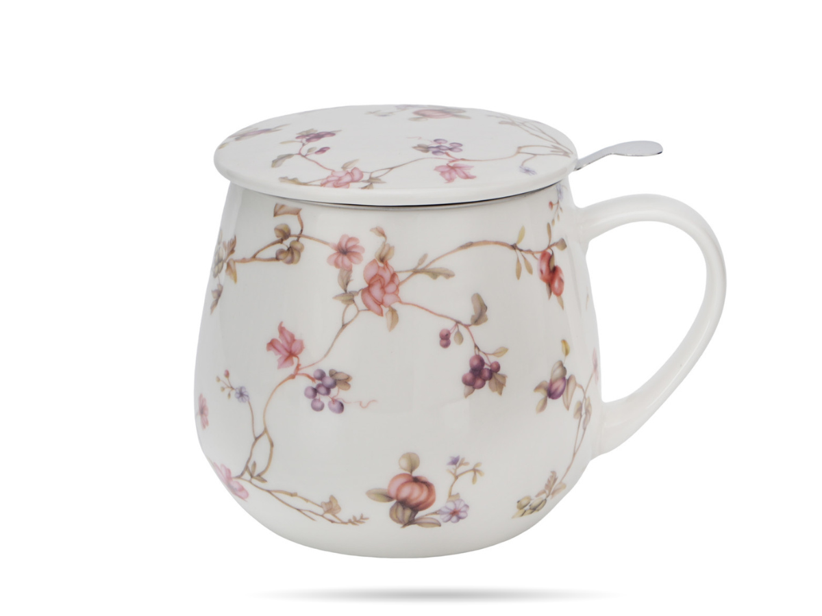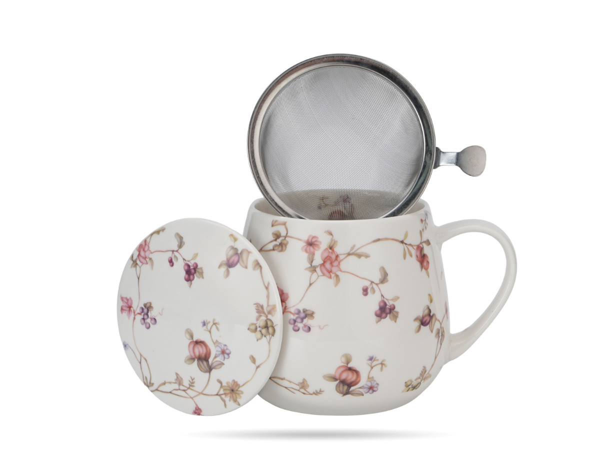 Pojemność 430 ml pozwala komfortowo zaparzyć ulubioną herbatę liściastą lub mieszankę ziołową, a dołączony metalowy zaparzacz umożliwia pełną kontrolę nad intensywnością naparu. Porcelanowa pokrywka pomaga utrzymać temperaturę i może służyć jako podstawka pod zaparzacz po zaparzeniu. Całość dopełnia ozdobne opakowanie, dzięki czemu kubek sprawdzi się jako gotowy kubek na prezent – bez dodatkowych przygotowań.