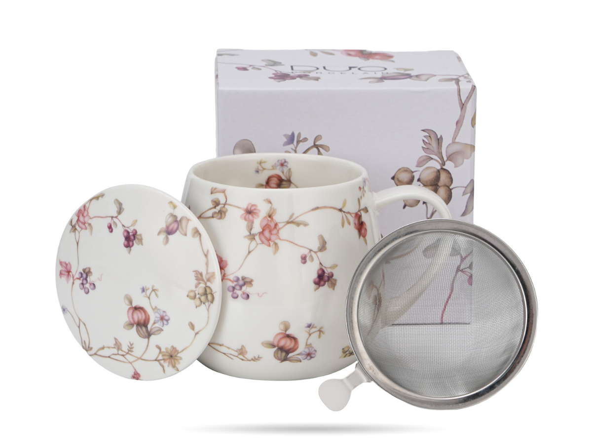 Porcelanowy kubek z zaparzaczem DUO 430 ml w ozdobnym opakowaniu. Idealny na prezent i do codziennego parzenia herbaty.