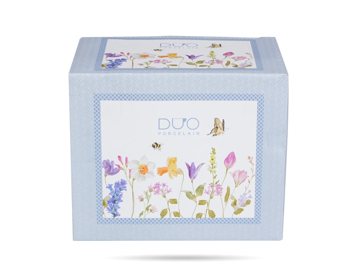 Dekoracja inspirowana naturą przedstawia harmonijną kompozycję kwiatów – od słonecznych żonkili po delikatne tulipany i lawendę. Całość dopełniają detale w postaci pszczoły i motyla, które nadają kubkowi lekkości i wyjątkowego charakteru. Dzięki dużej pojemności kubek świetnie sprawdzi się nie tylko do kawy czy herbaty, ale również jako naczynie na zupy, płatki czy desery.
