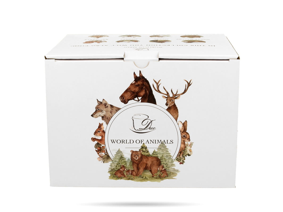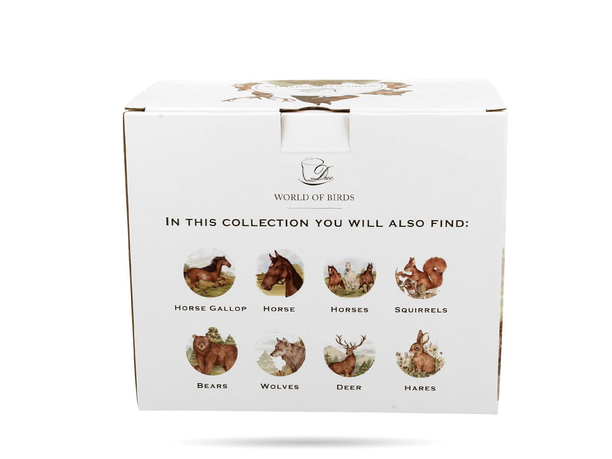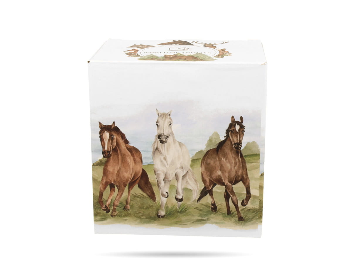 Elegancki kubek porcelanowy z zaparzaczem (400 ml) z kolekcji Świat Zwierząt – Konie w galopie DUO. Wykonany z lekkiej i wytrzymałej porcelany New Bone China, z motywem galopujących koni. W zestawie stalowy zaparzacz i porcelanowa pokrywka. Zapakowany w ozdobne pudełko – idealny na prezent.