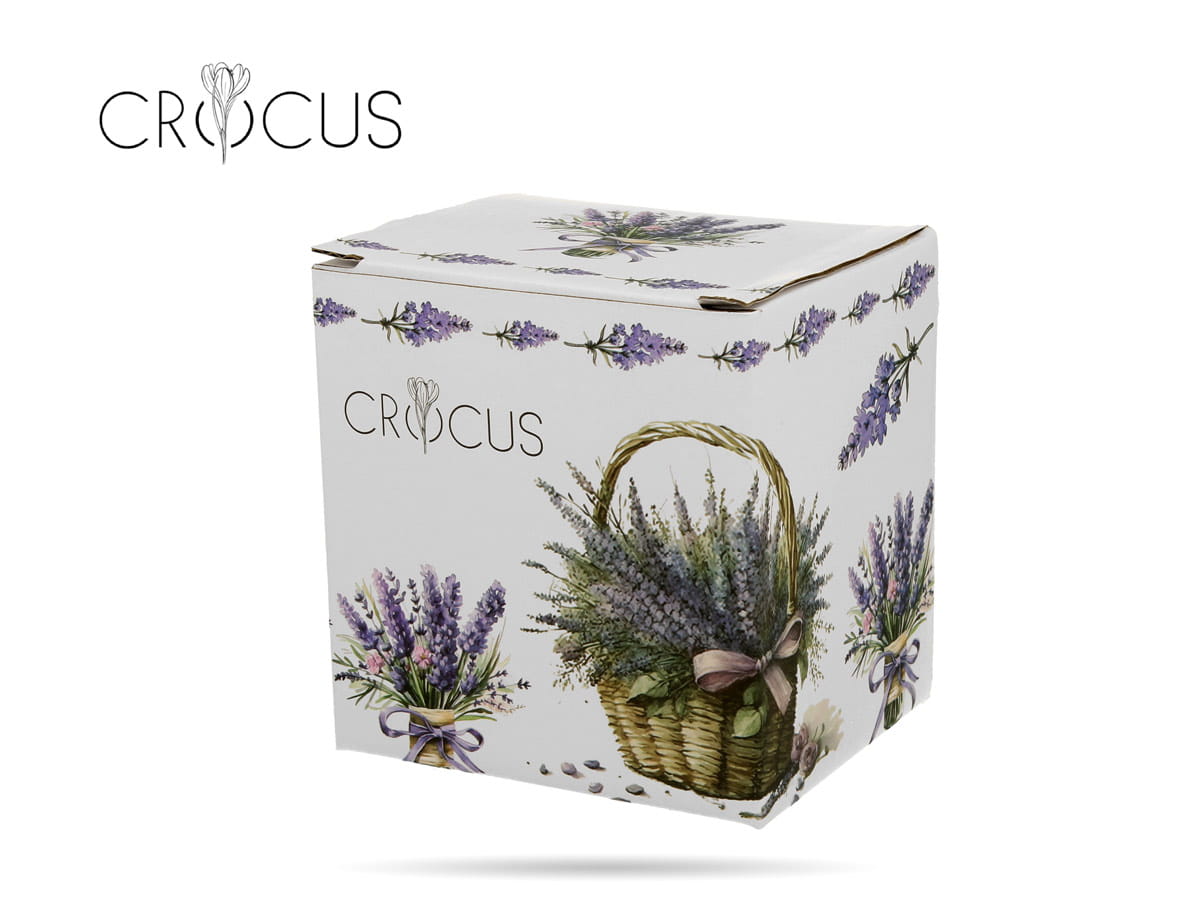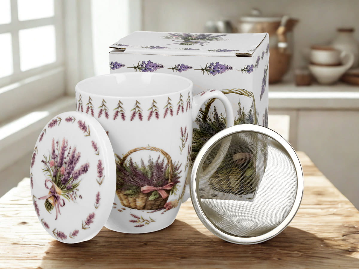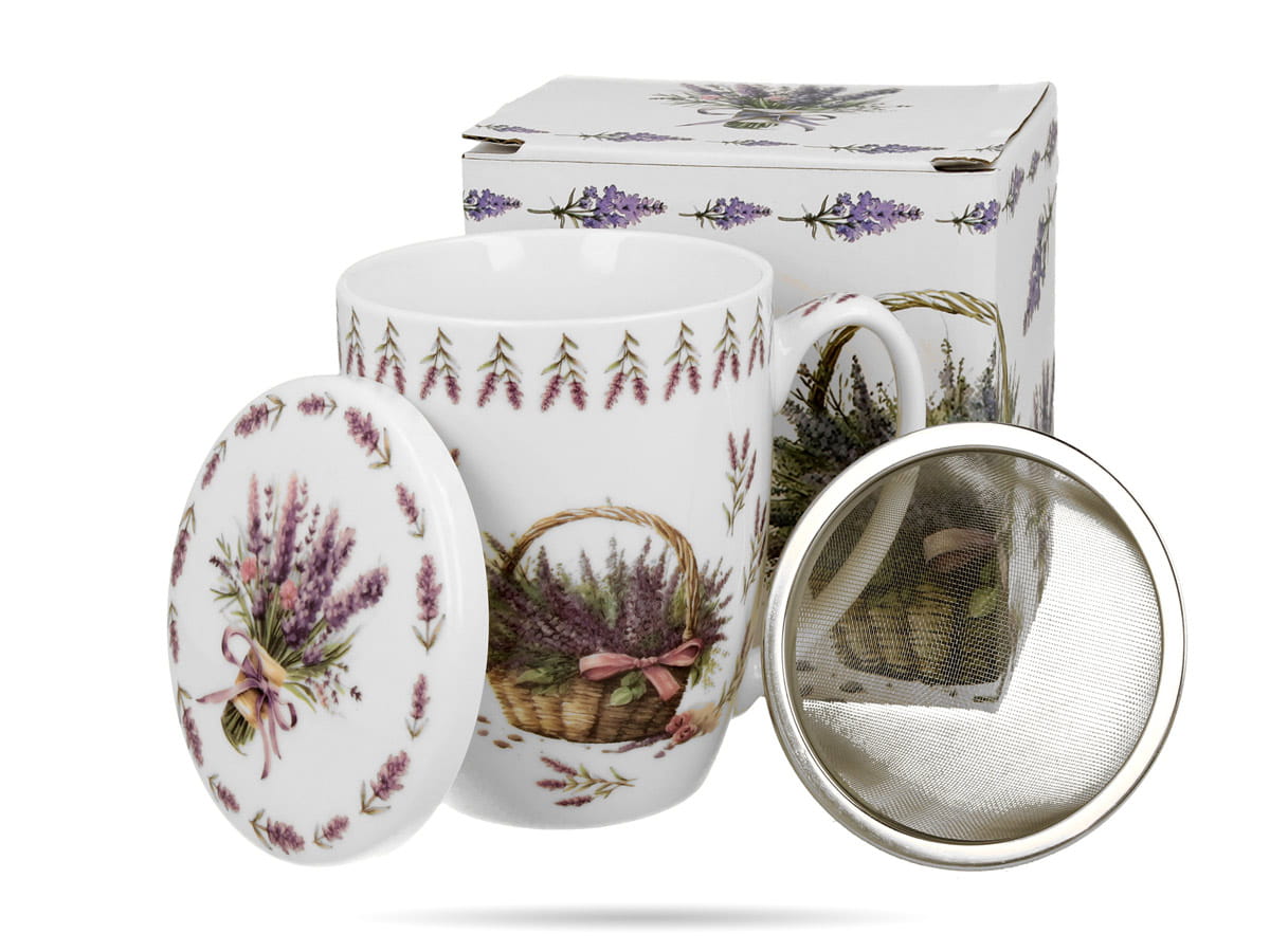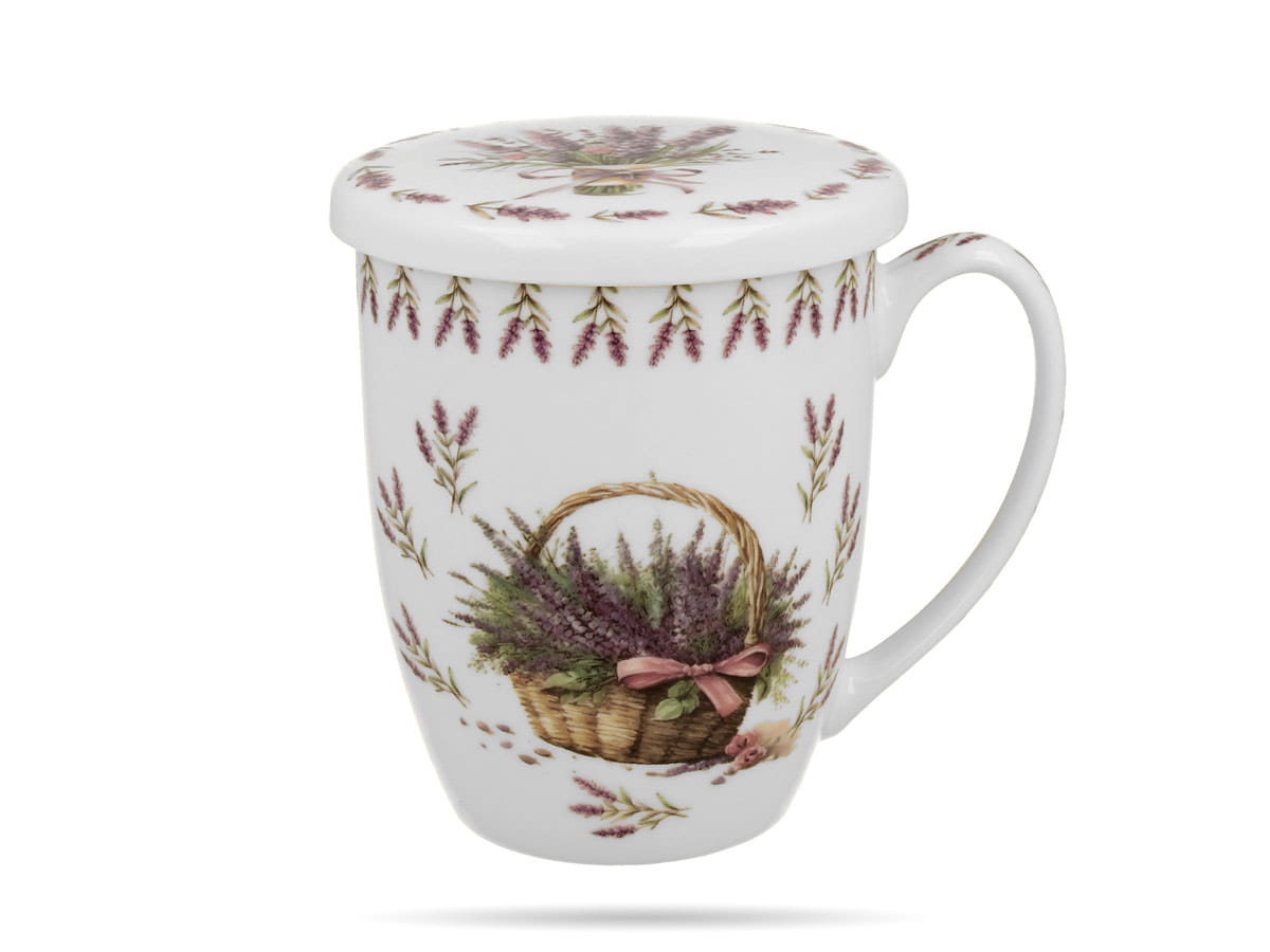 Klasyczny kubek zdobiony kolorowym motywem bujnej lawendy w wiklinowym koszu Wykonany z porcelany New Bone China - lekkiej, ale także mocnej i trwałej. W zestawie z pokrywką i praktycznym zaparzaczem.