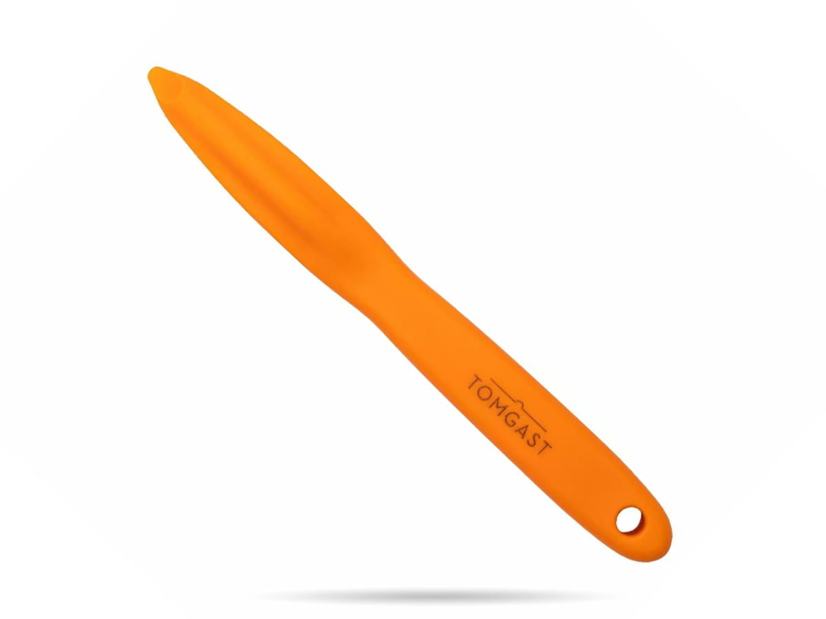 Obieraczka do warzyw TOMGAST pomarańczowa – ergonomiczna, ze stalowym ostrzem węglowym. Trwała, łatwa w czyszczeniu, z osłoną i uchwytem do zawieszenia.
