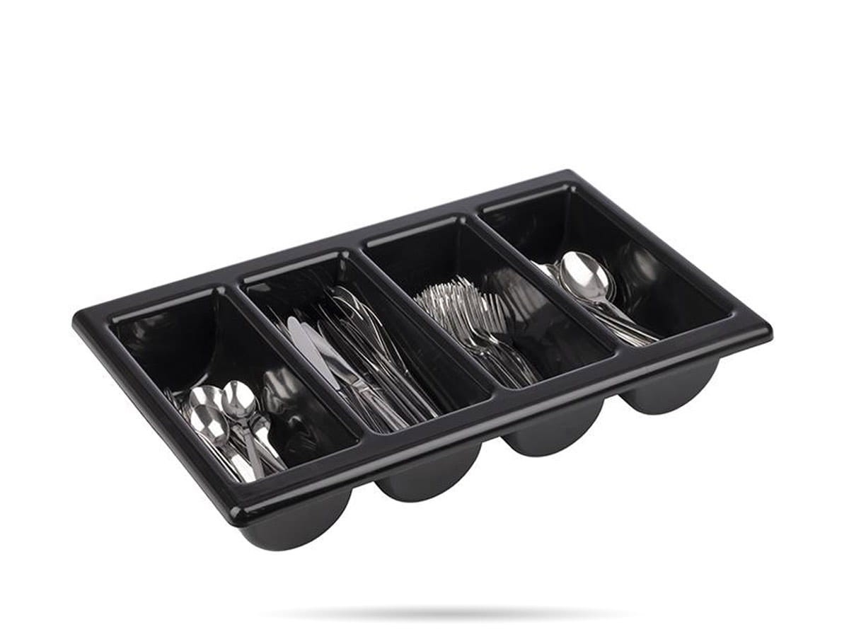 Czarny pojemnik na sztućce GN 1/1 marki APS z 4 otworami, wykonany z trwałego polipropylenu. Idealny do organizacji sztućców w bufetach, restauracjach i stołówkach.
