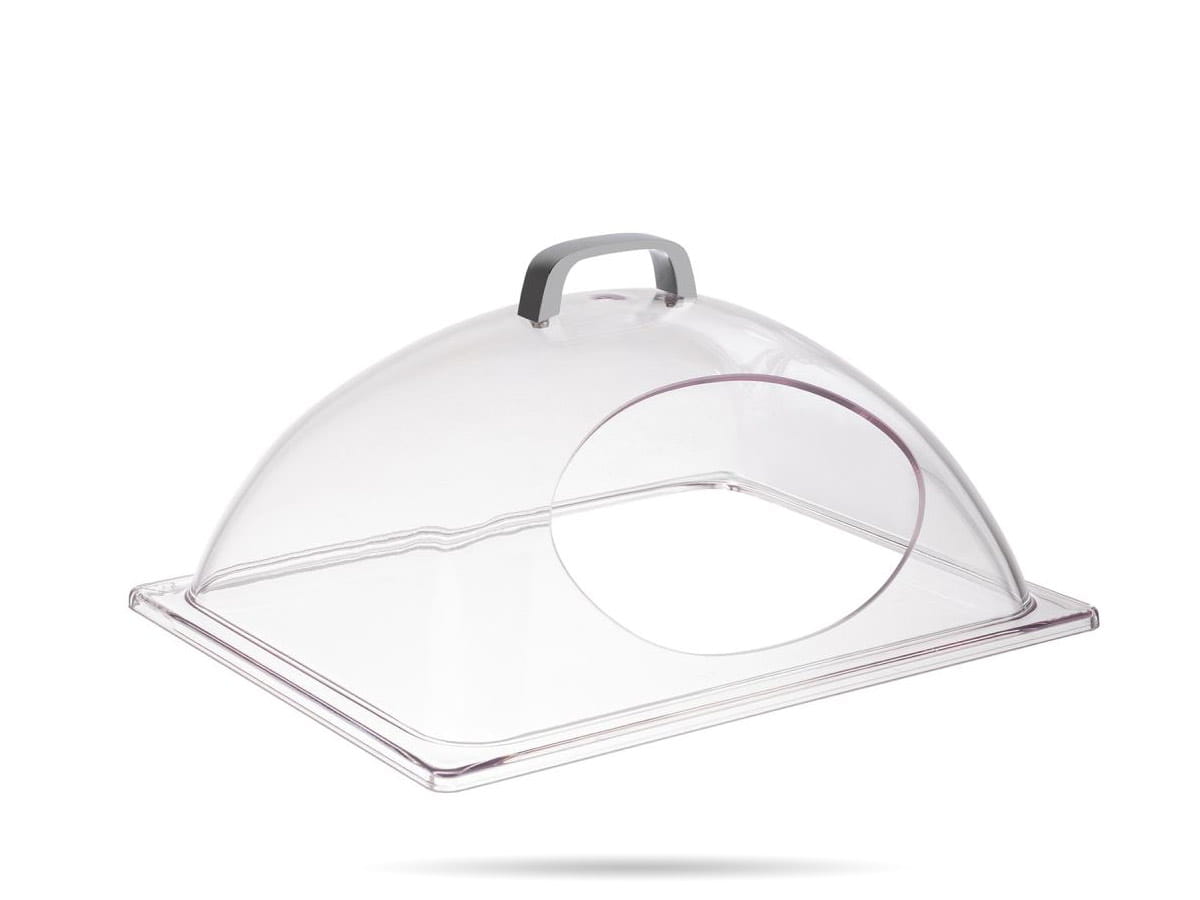 Pokrywa kopuła GN 1/2 APS wykonana z przezroczystego tworzywa sztucznego z chromowanym uchwytem z odlewu cynkowego. Wyposażona w praktyczne wycięcie z przodu, które umożliwia wygodny dostęp do potraw bez konieczności całkowitego podnoszenia pokrywy.