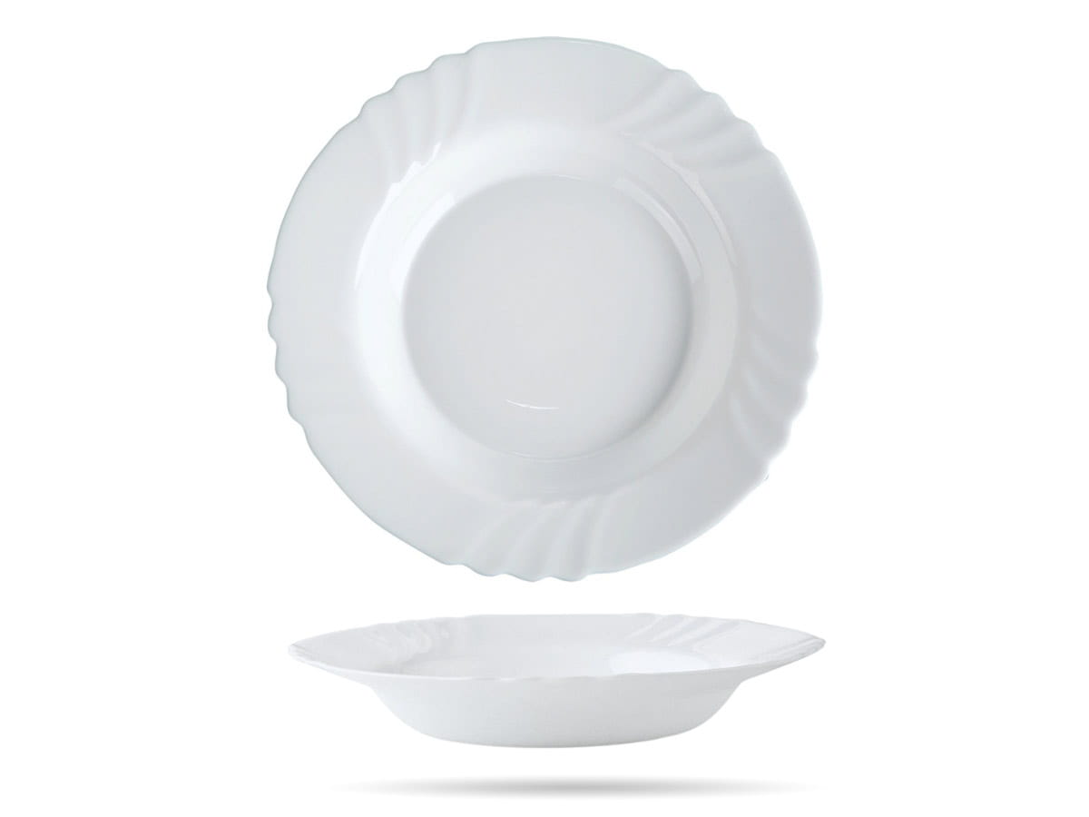 Biały talerz głęboki, z delikatnym zdobieniem na brzegach. Lekki i mocny, łatwy w czyszczeniu. Talerz do domu i gastronomii.